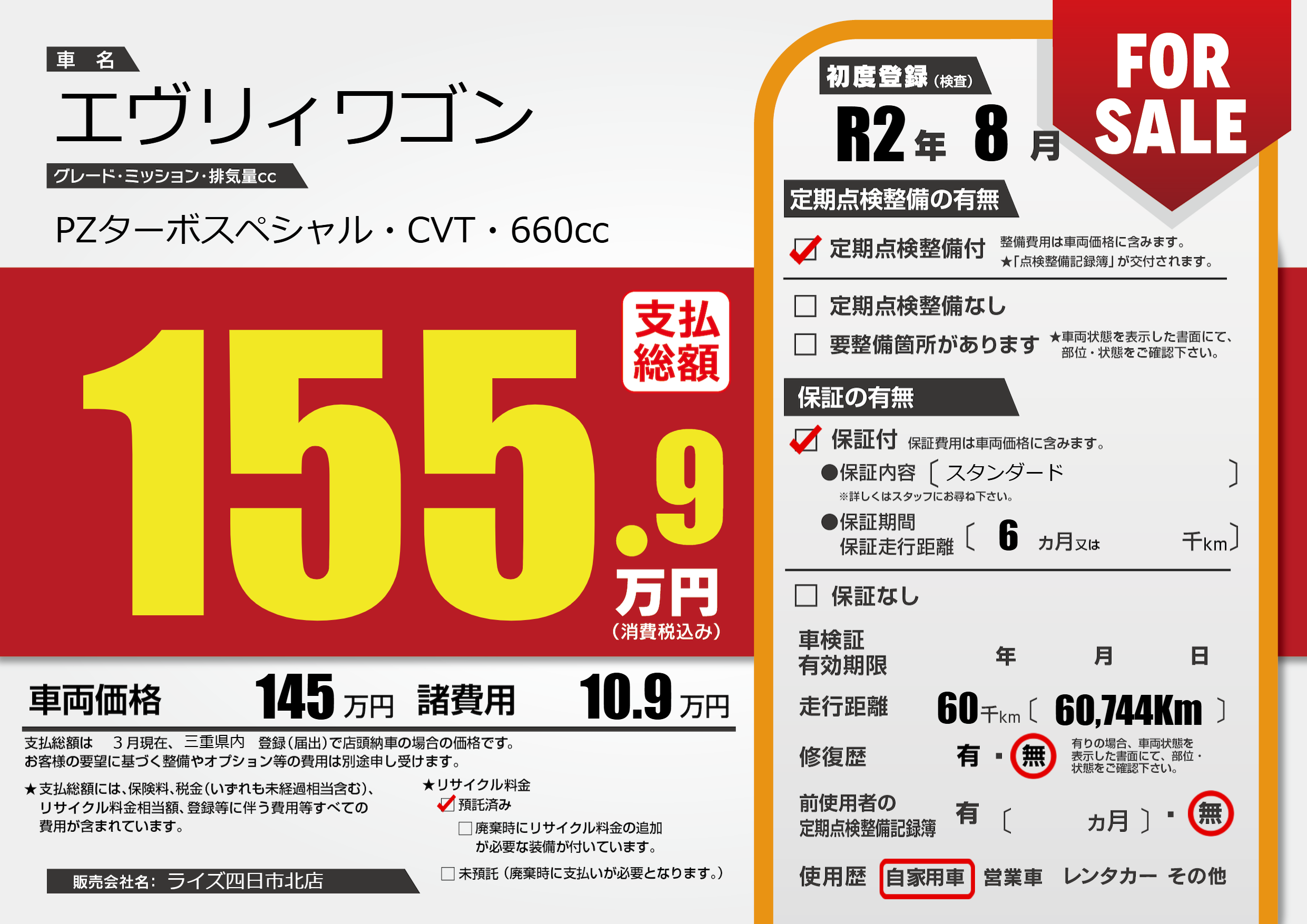 | 車名 | エヴリィワゴン | グレード ミッション 排気量 |