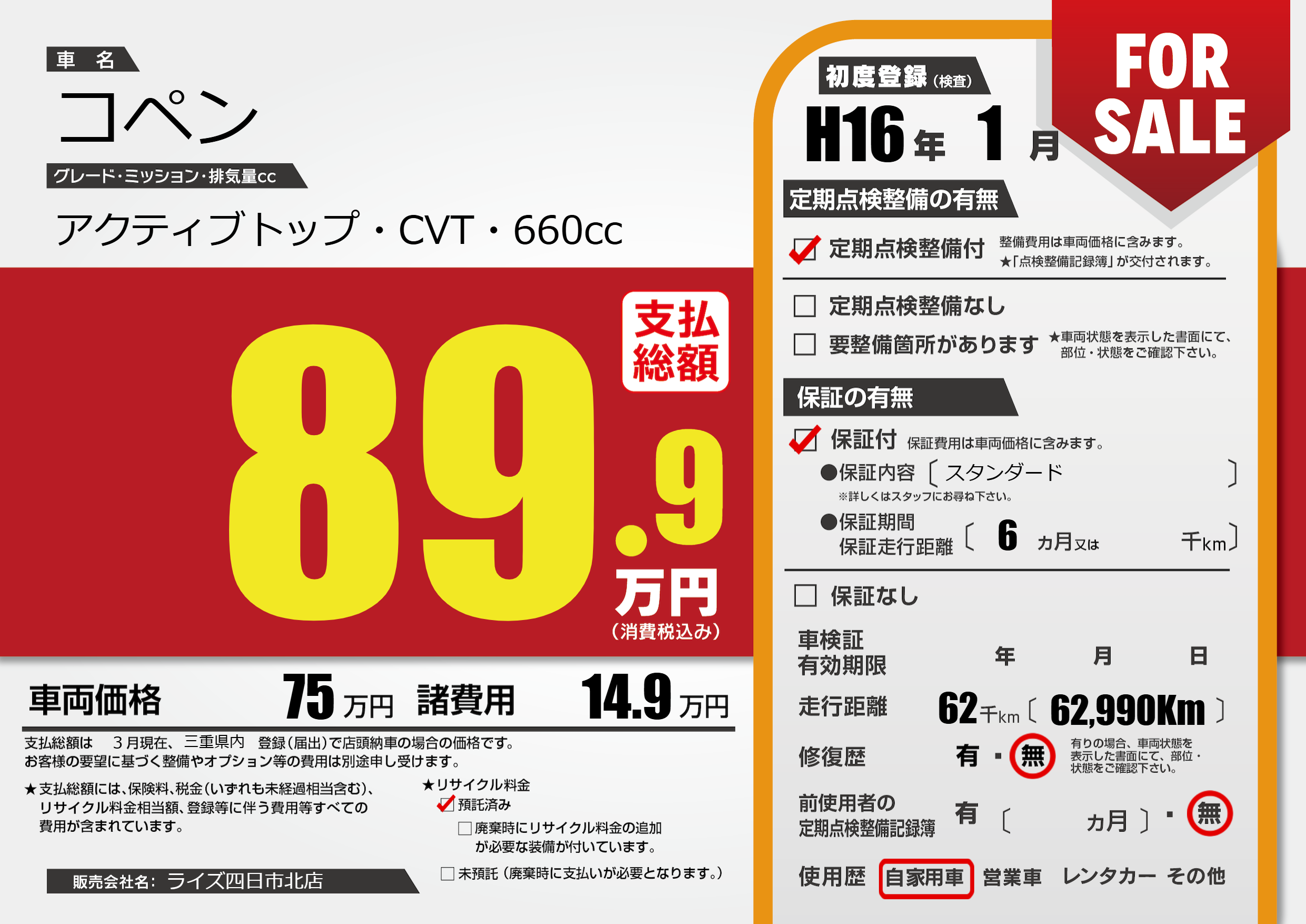 | 走行キロ | 6.2万km | 初年度登録 | H16年1月 |