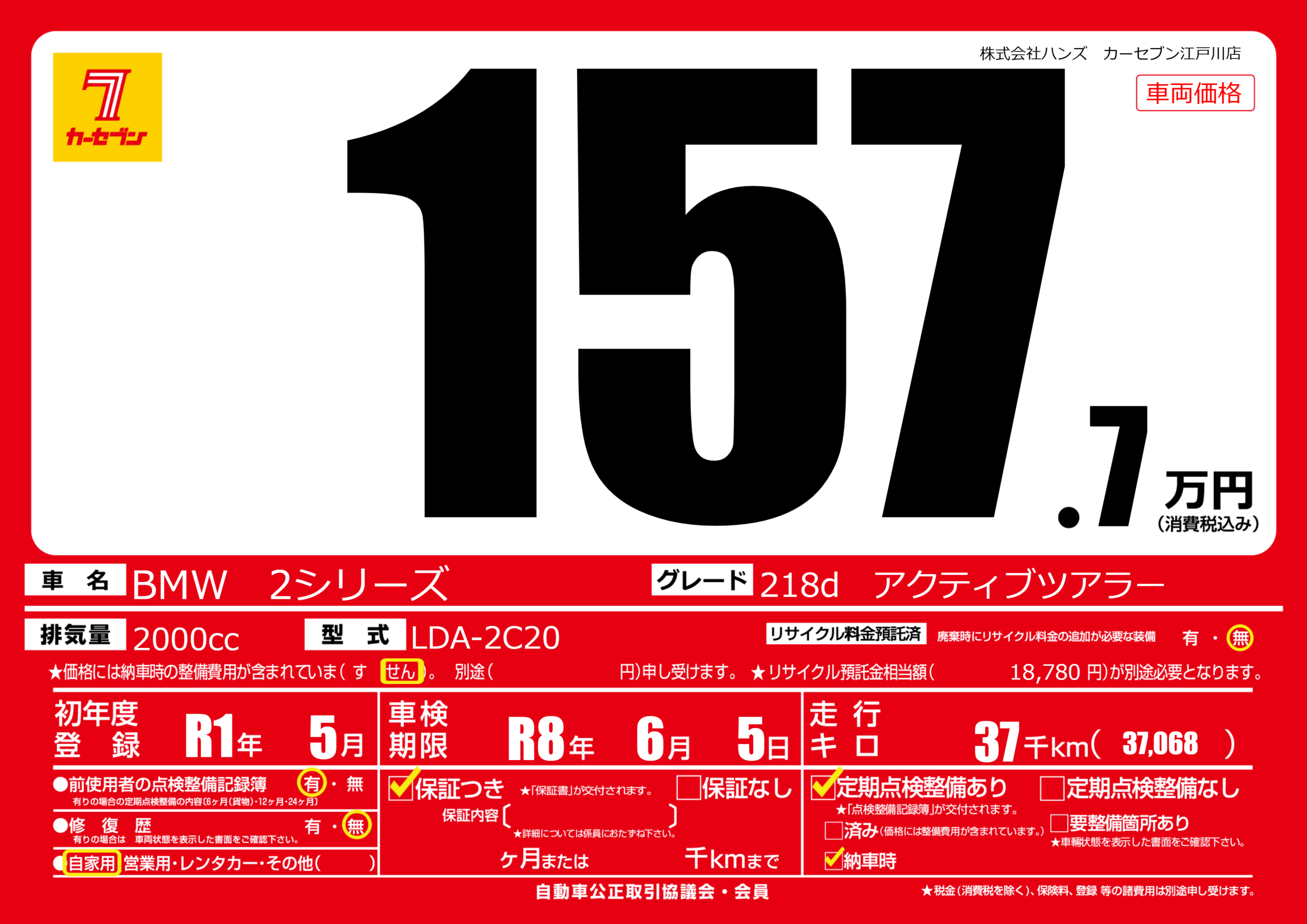 | 車名 | BMW 2シリーズ | グレード ミッション 排気量 |