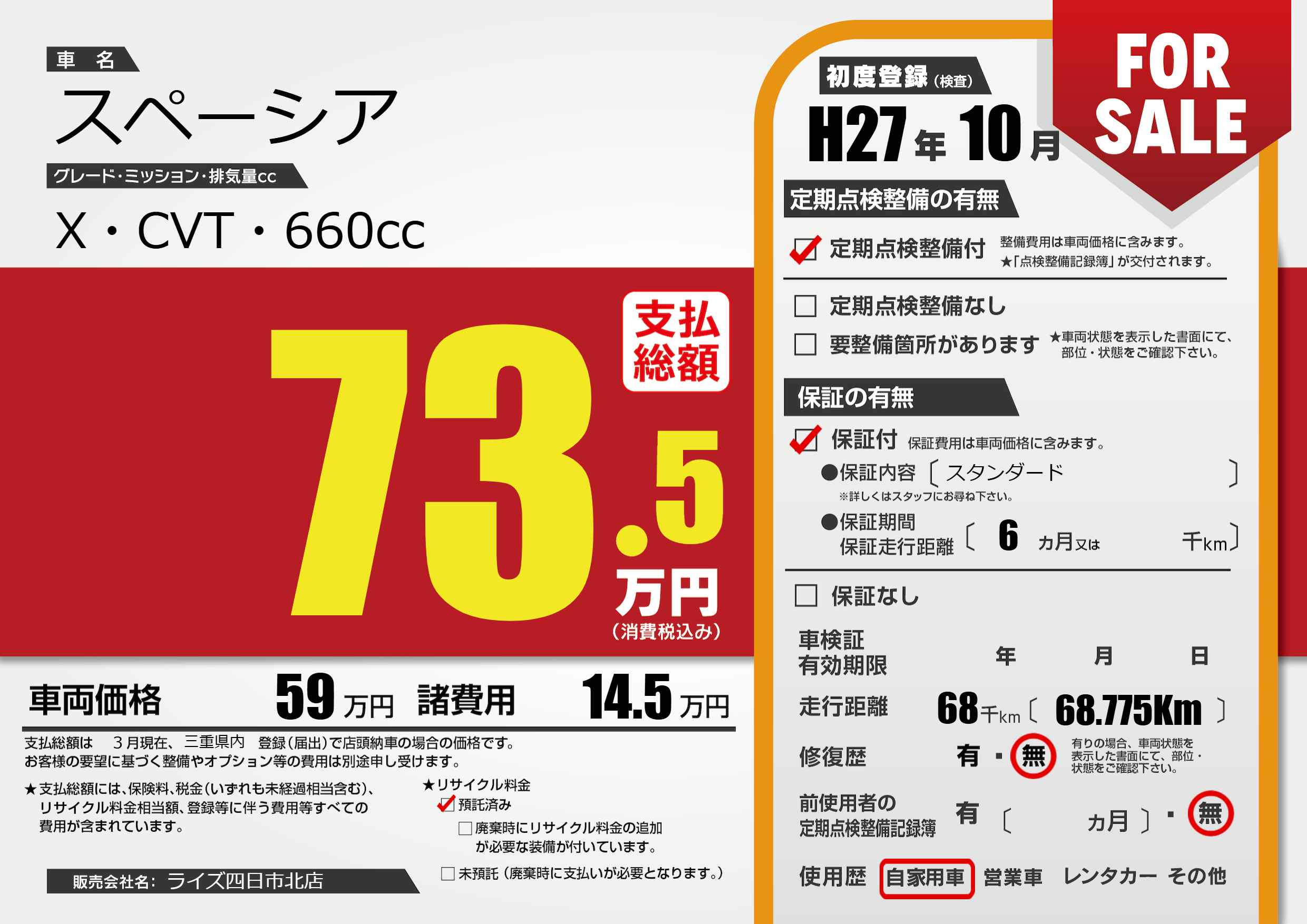 | 車名 | スペーシア | グレード ミッション 排気量 |