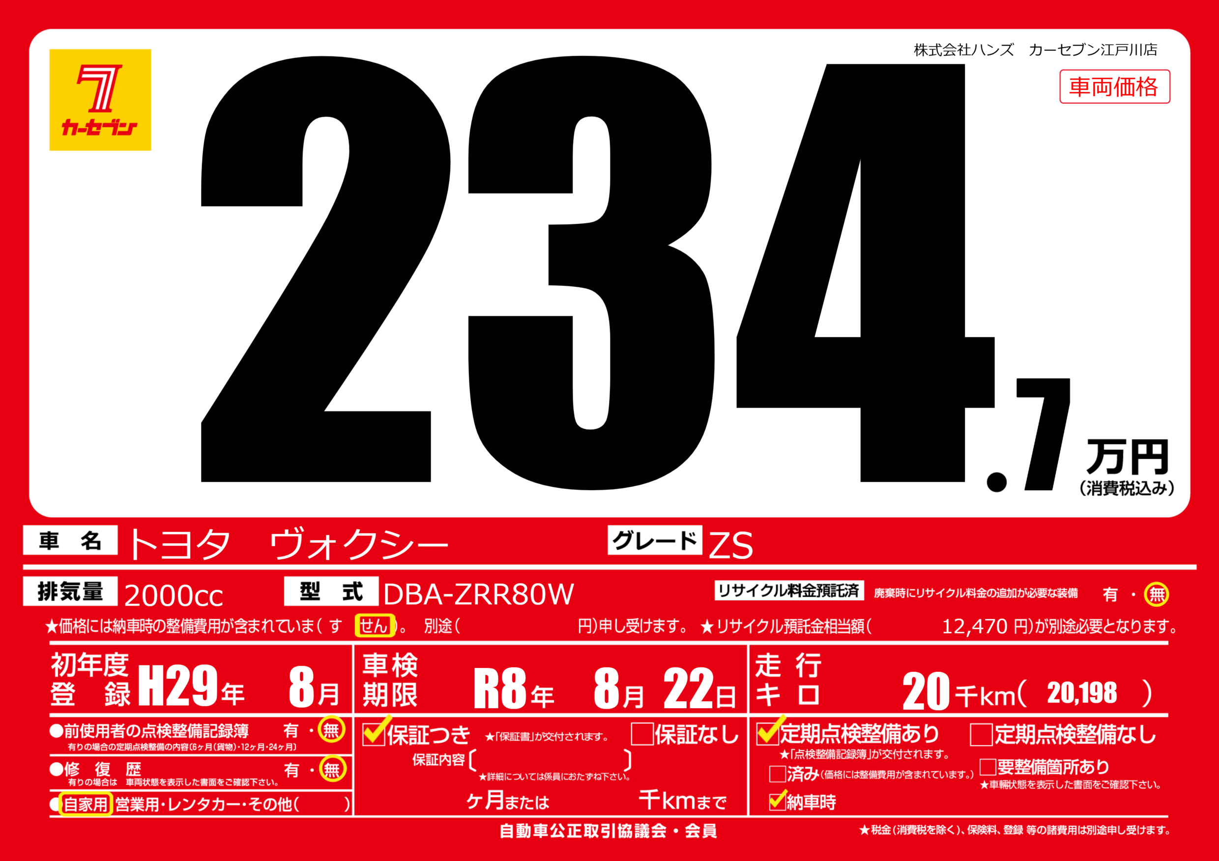 | 車名 | トヨタ ヴォクシー | グレード ミッション 排気量 |