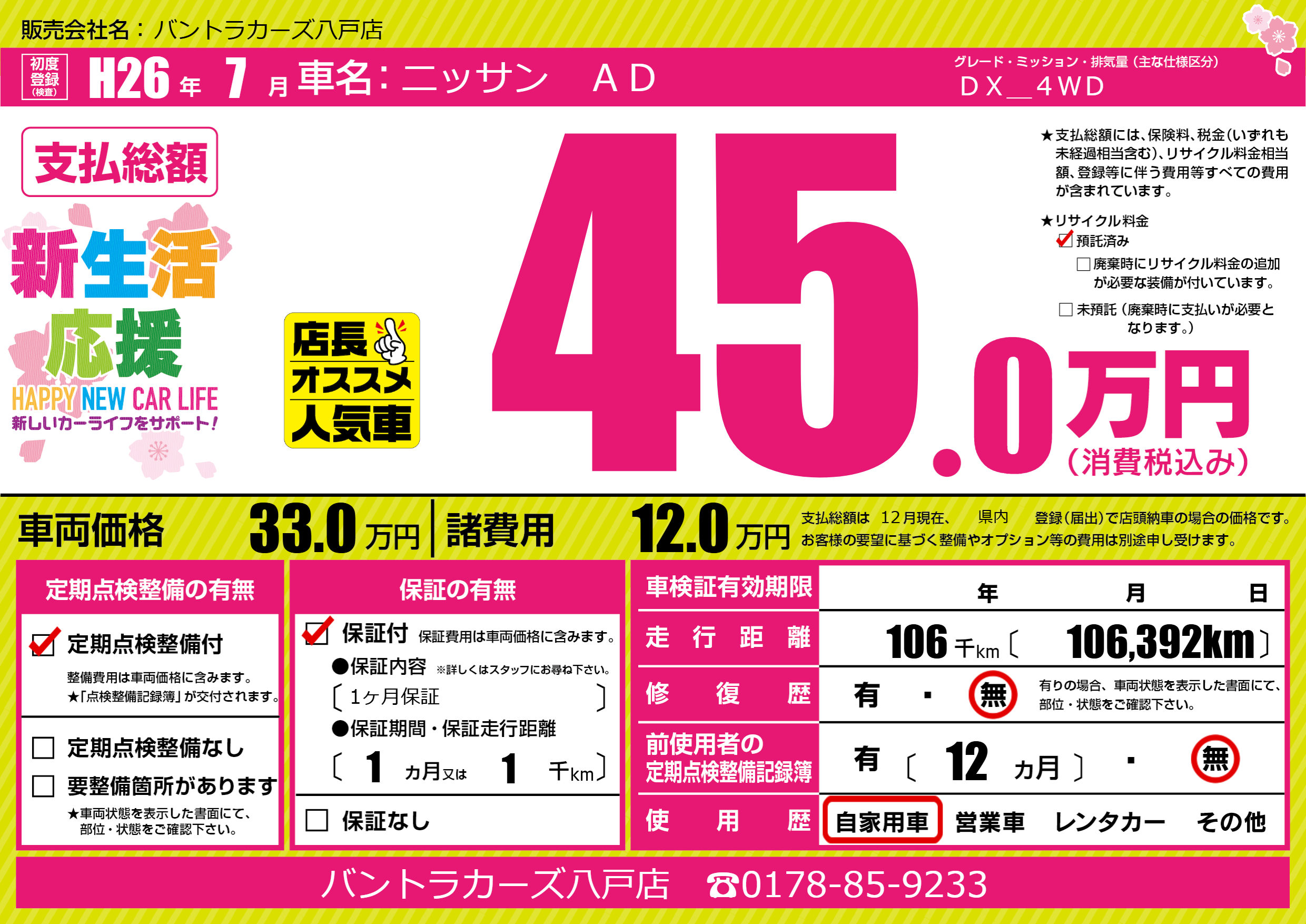 | 車名 | ニッサン AD | グレード ミッション 排気量 |