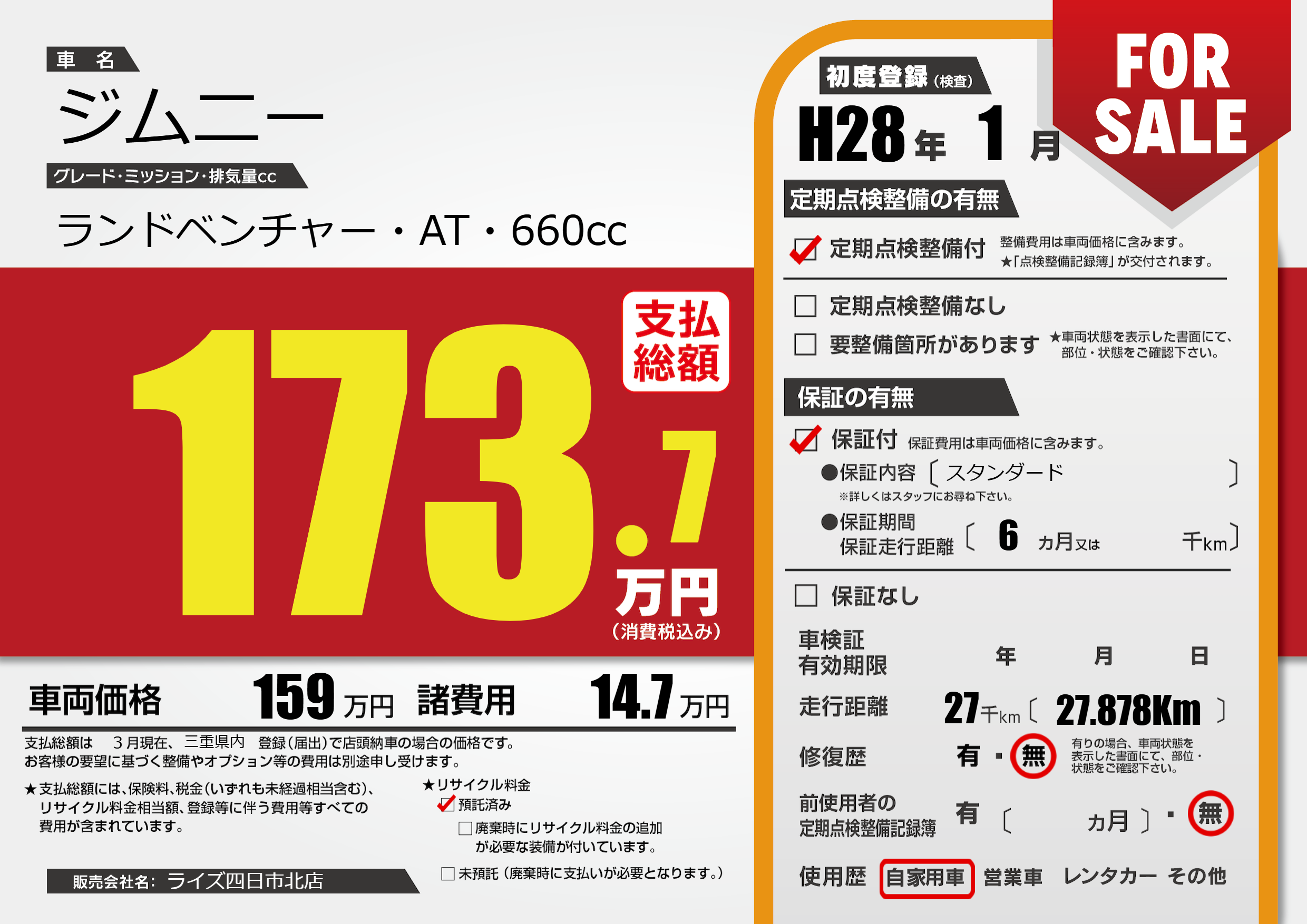 | 車名 | ジムニー | グレード ミッション 排気量 |