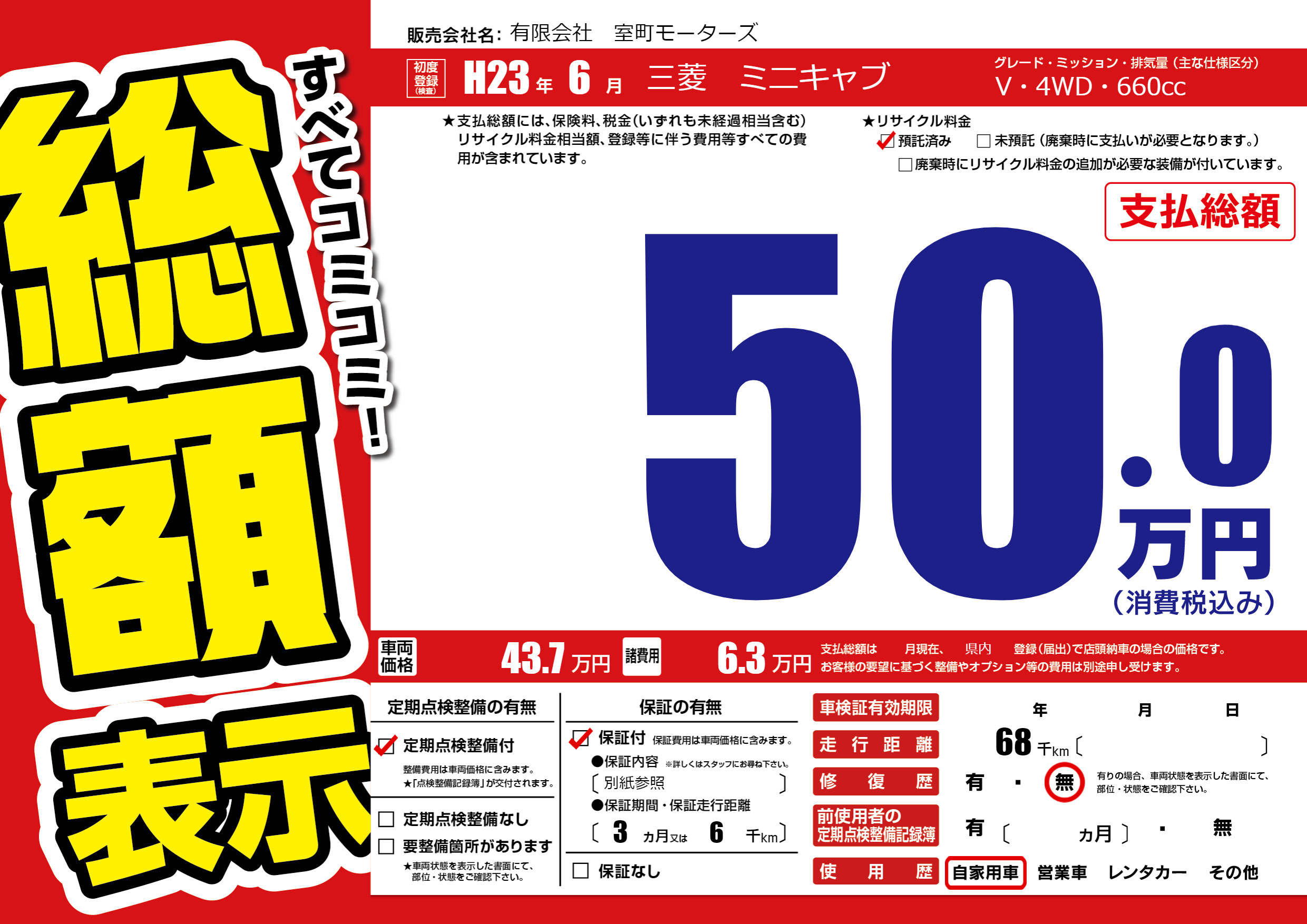 保証付き 保証内容(別紙参照) 3ヶ月または(6)千kmまで |