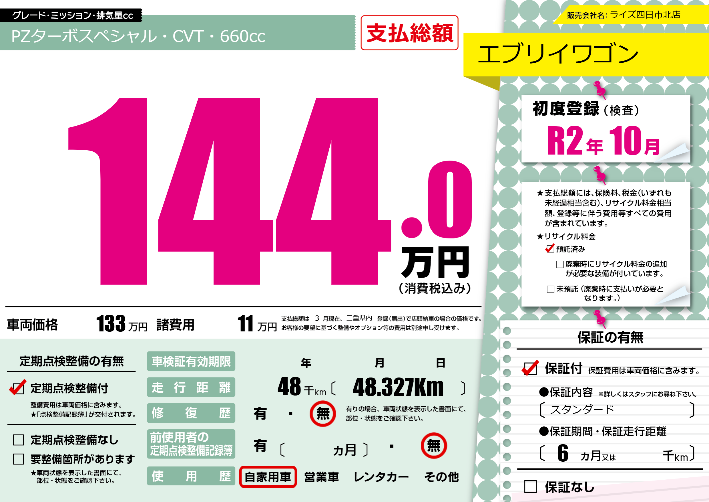 | 車名 | エブリイワゴン | グレード ミッション 排気量 |