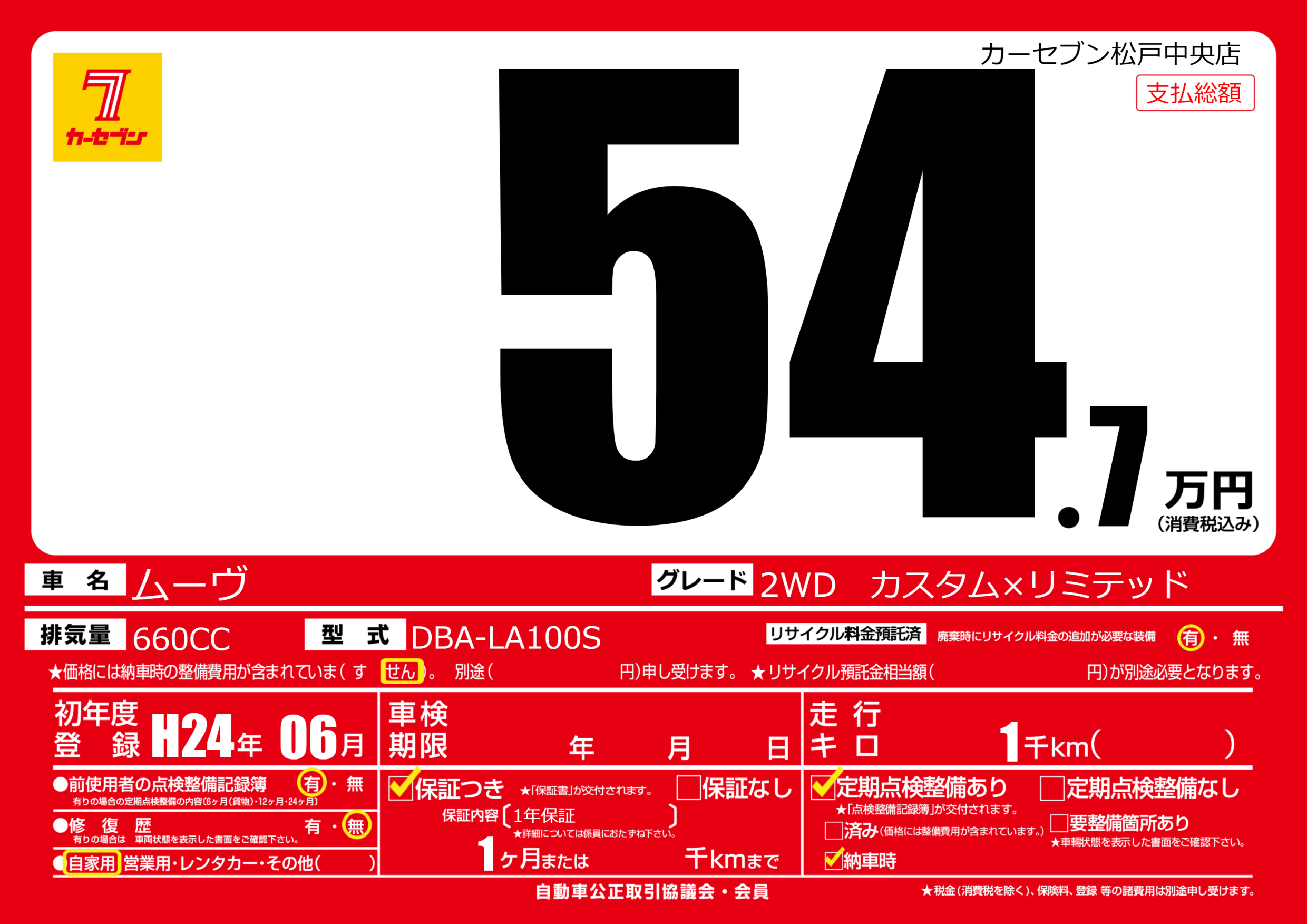 | 走行キロ | 0.1万km | 初年度登録 | H24年06月 |