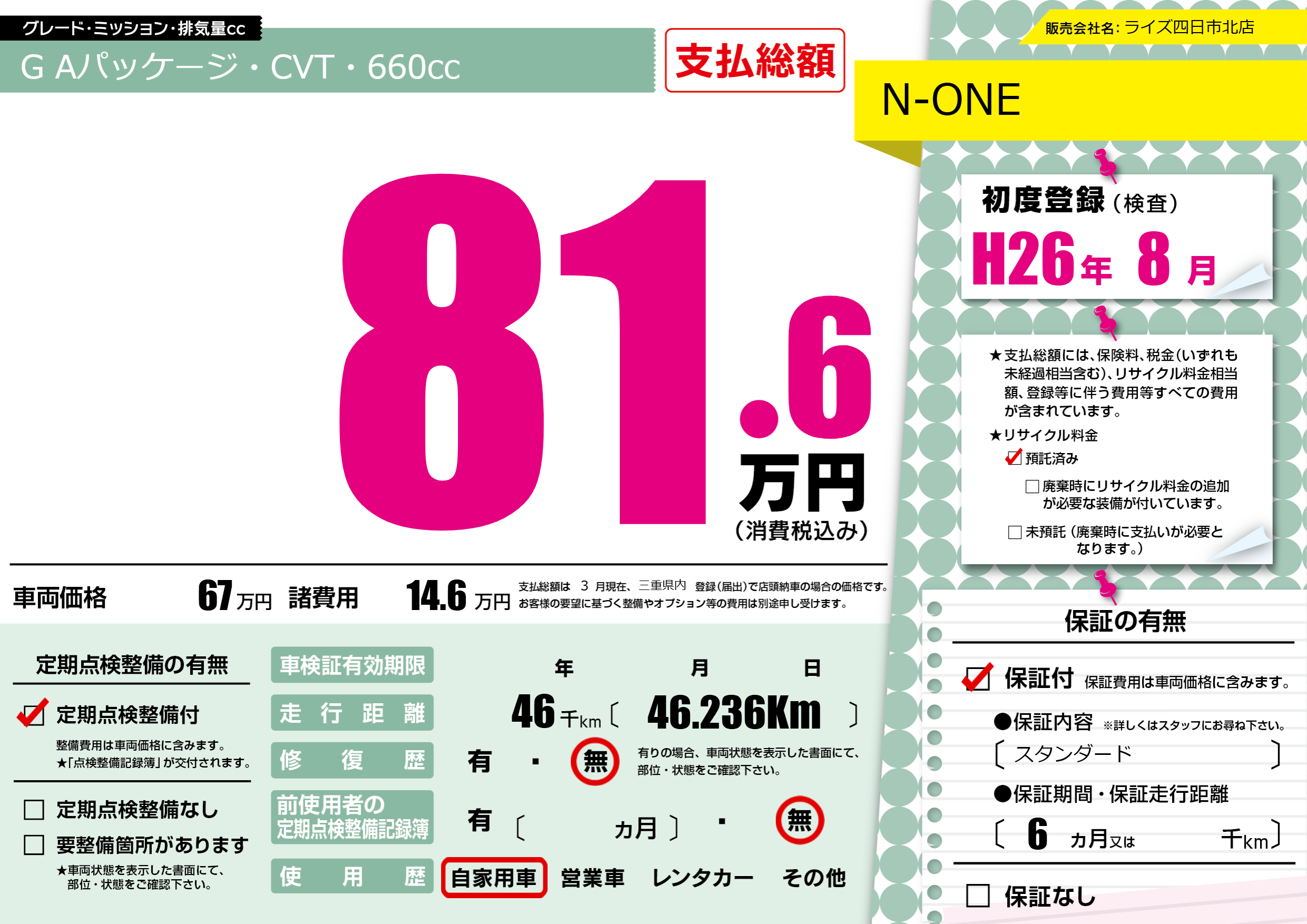 | 車名 | N-ONE | グレード ミッション 排気量 |