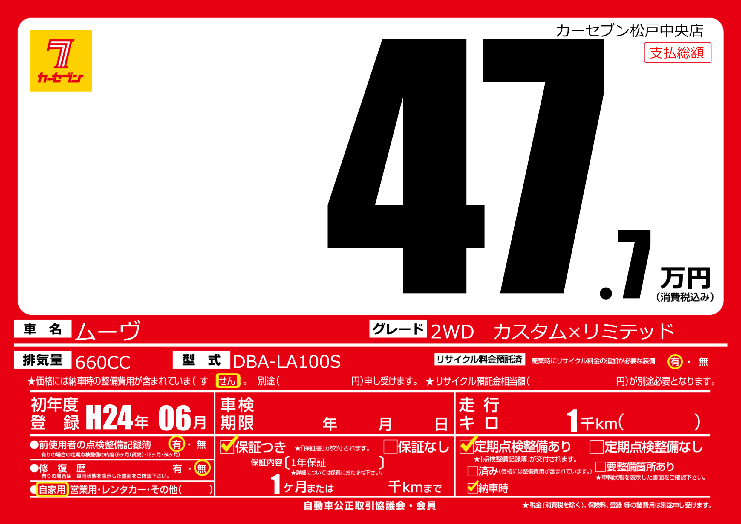 | 走行キロ | 0.1万km | 初年度登録 | H24年06月 |