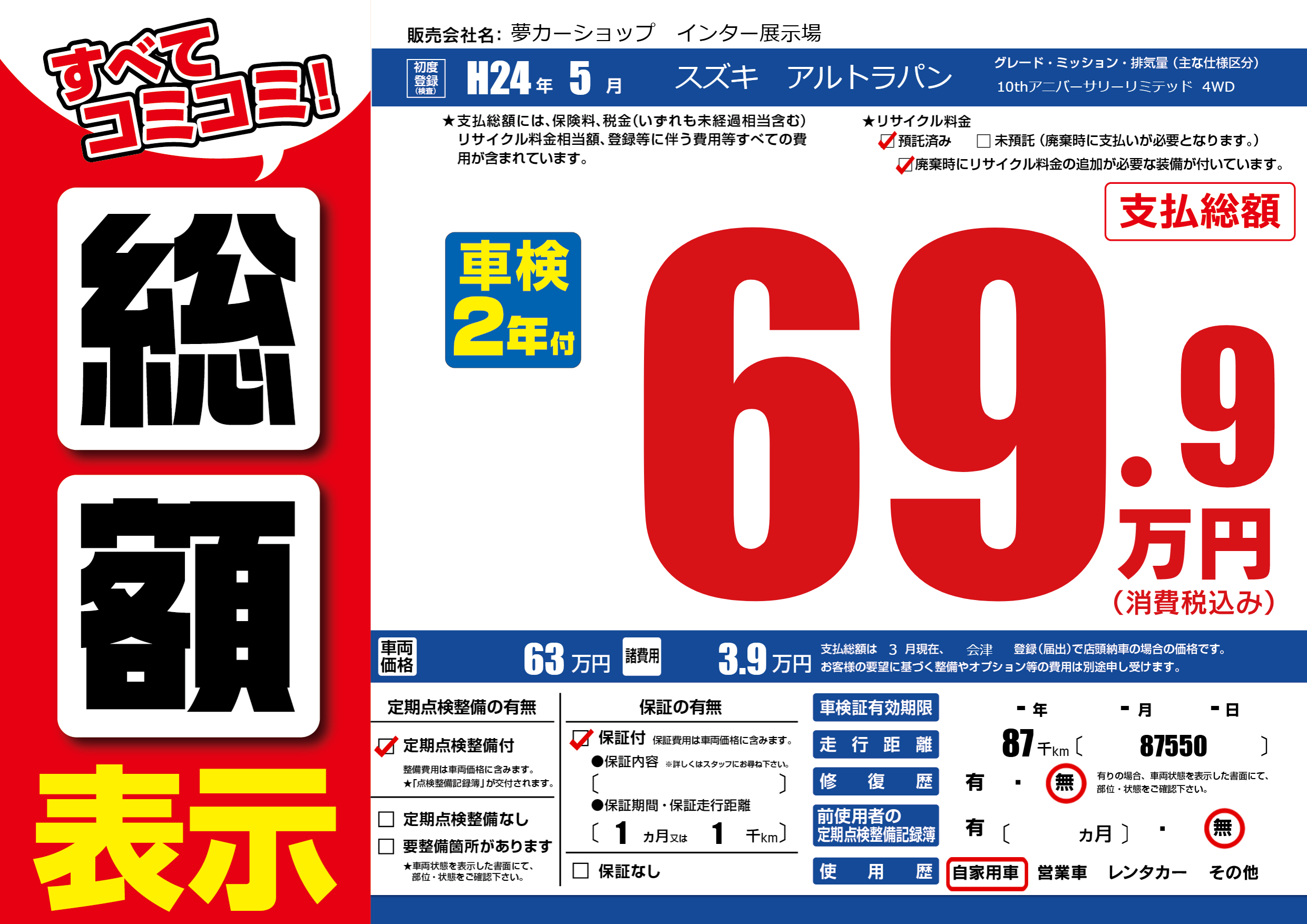| 走行キロ | 8.7万km | 初年度登録 | H24年5月 |