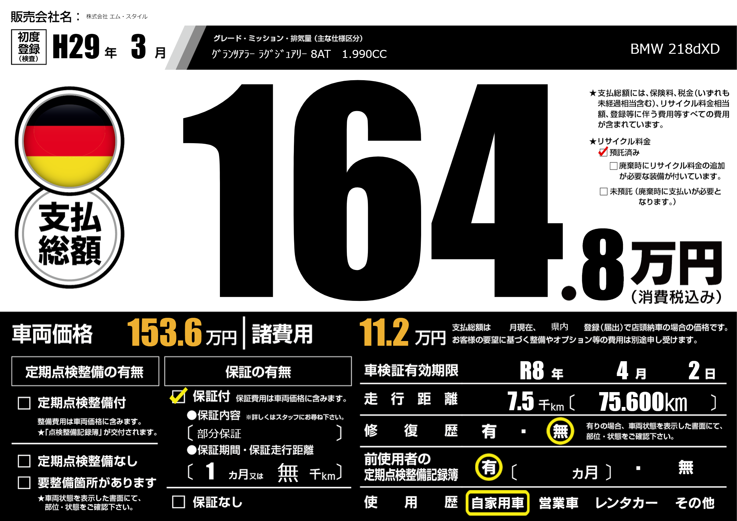 | 車名 | BMW 218dXD | グレード ミッション 排気量 |