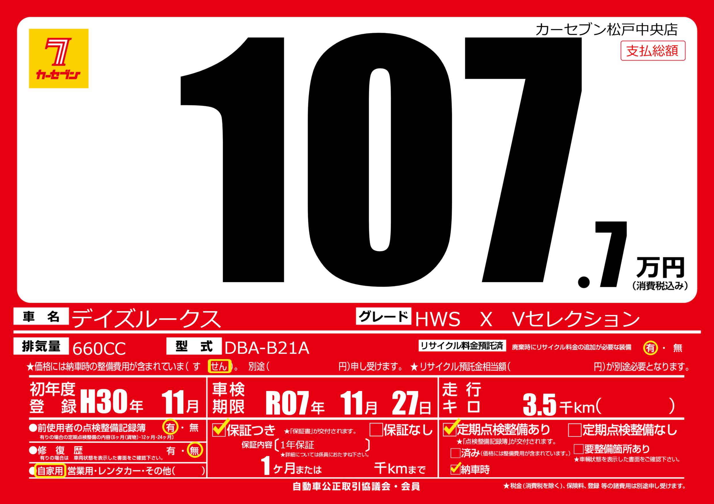 | 車名 | デイズルークス | グレード ミッション 排気量 |