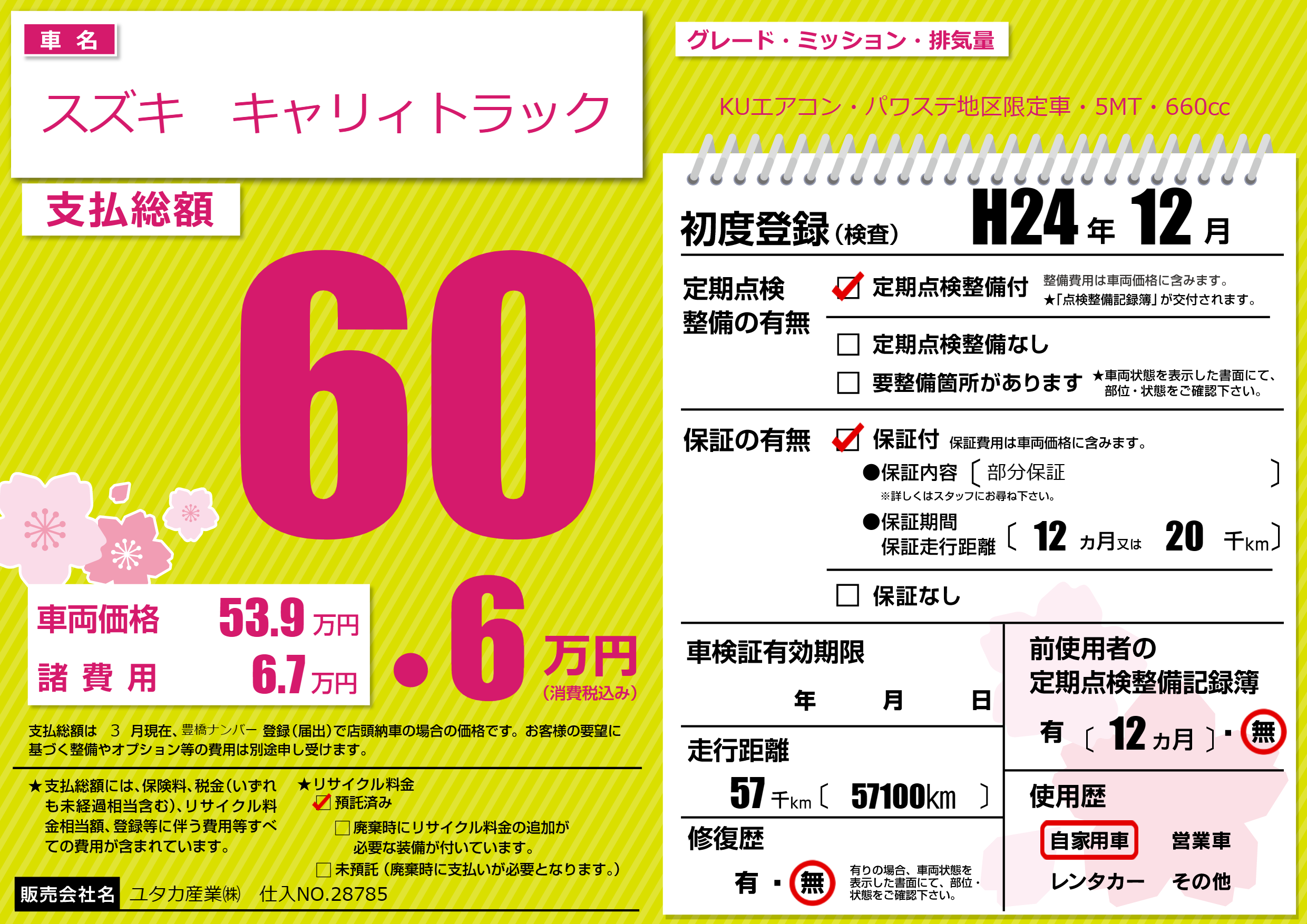 | 車名 | スズキ キャリィトラック | グレード ミッション 排気量 |
