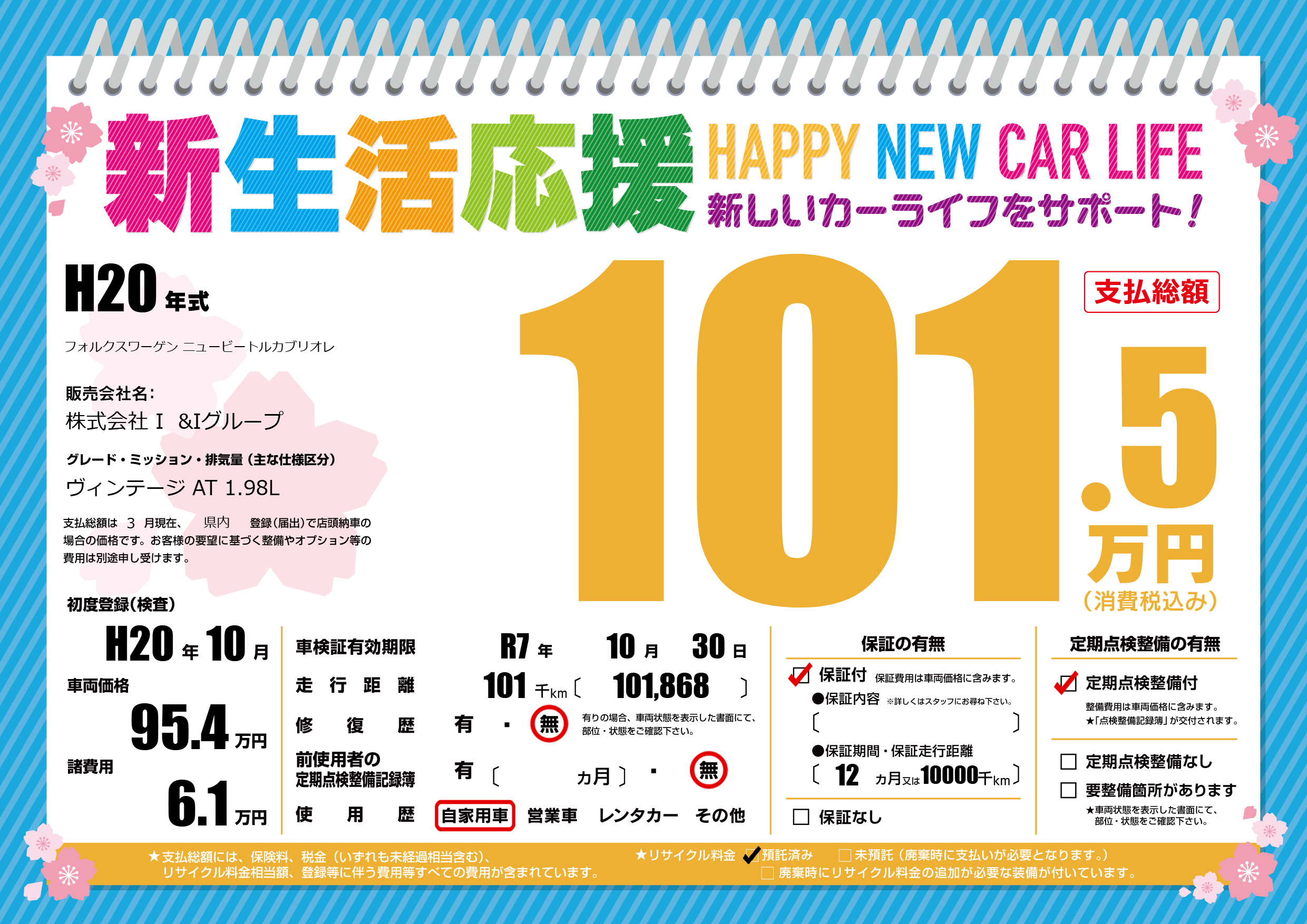 | 車名 | フォルクスワーゲン ニュービートルカブリオレ | グレード ミッション 排気量 |