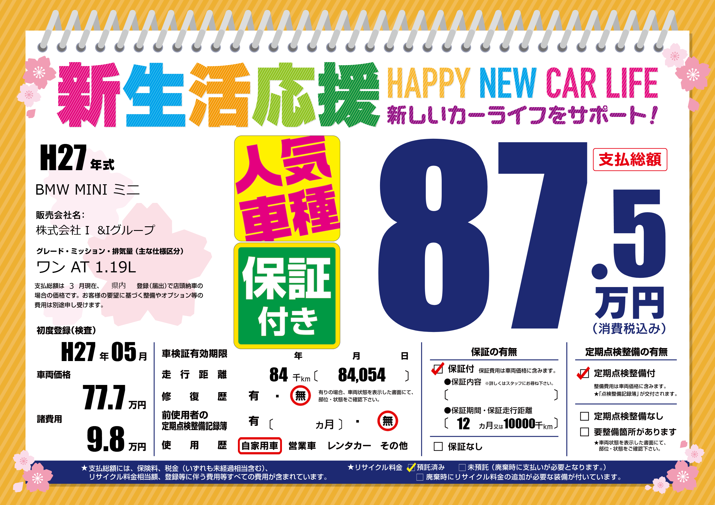 | 車名 | BMW MINI ミニ | グレード ミッション 排気量 |
