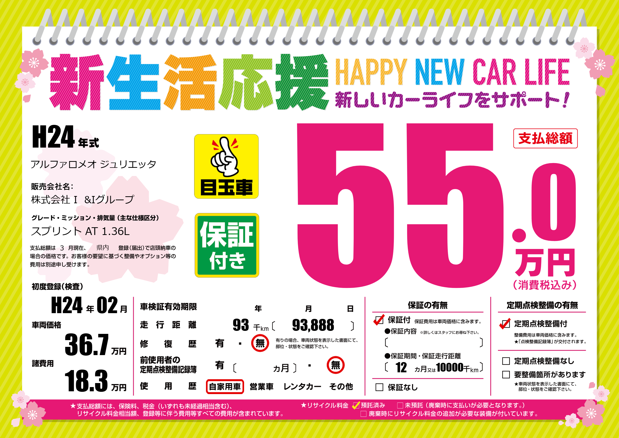 保証付き 保証内容(---) 12ヶ月または(10000)千kmまで |