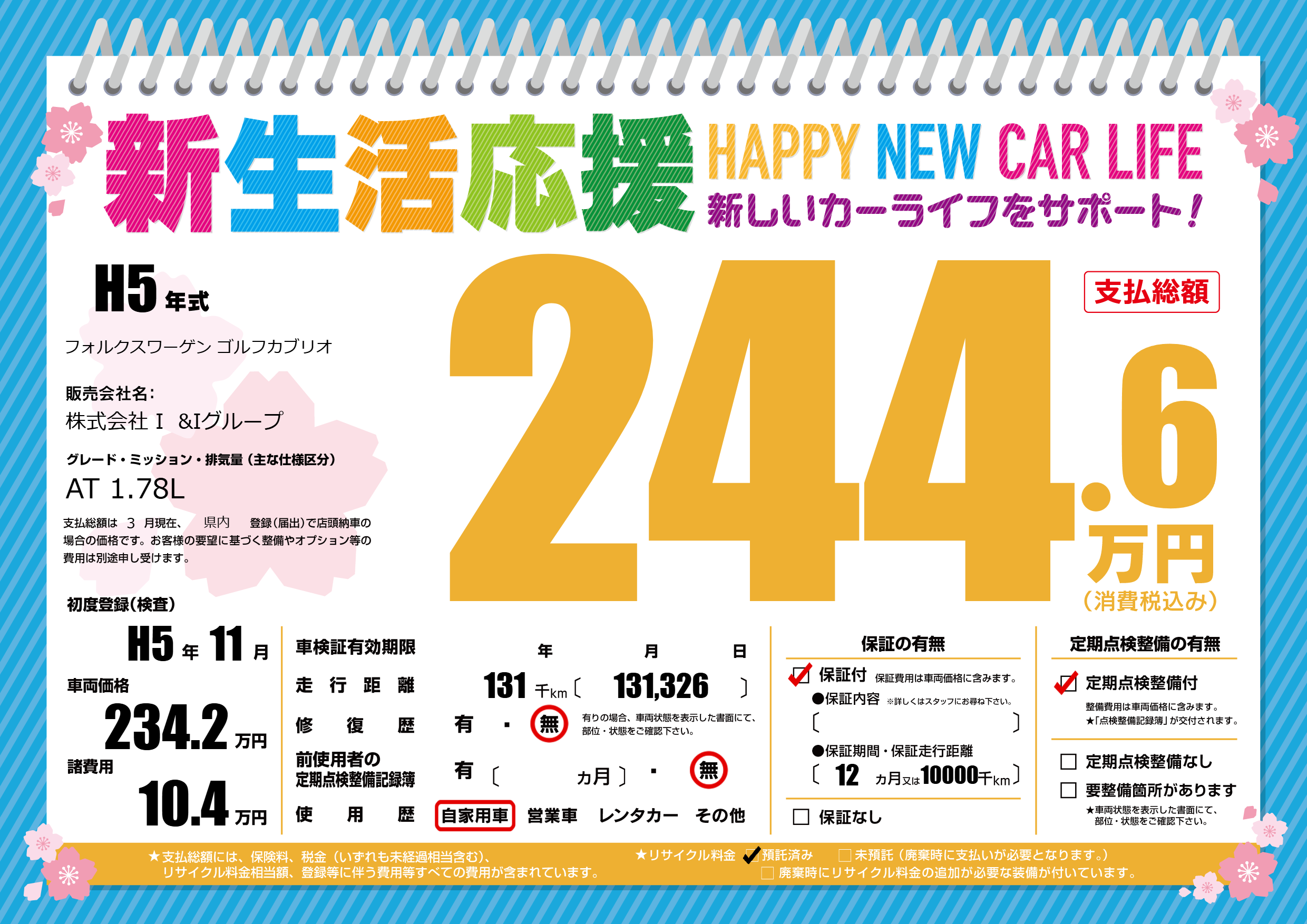 | 車名 | フォルクスワーゲン ゴルフカブリオ | グレード ミッション 排気量 |
