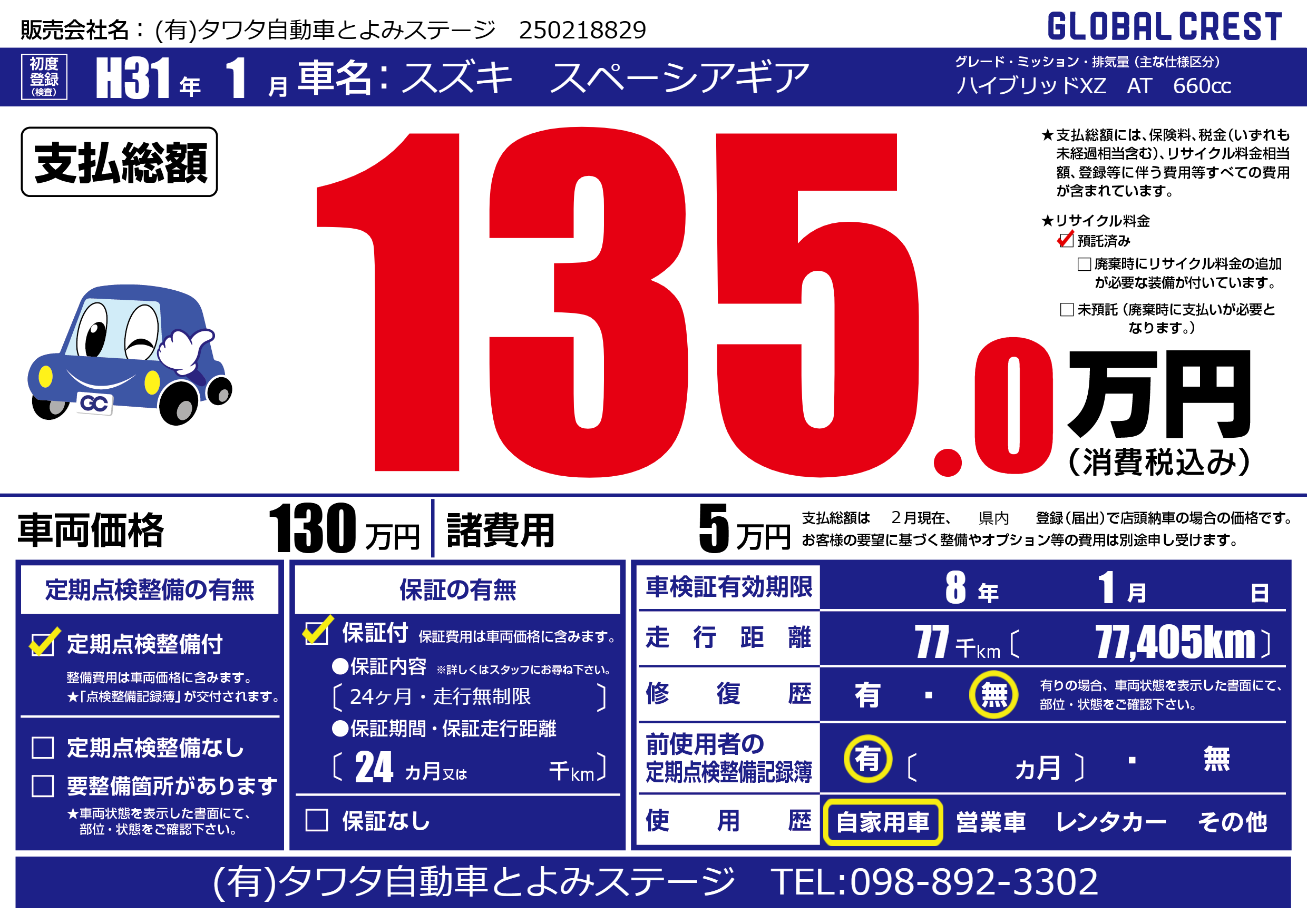 | 車名 | スズキ スペーシアギア | グレード ミッション 排気量 |