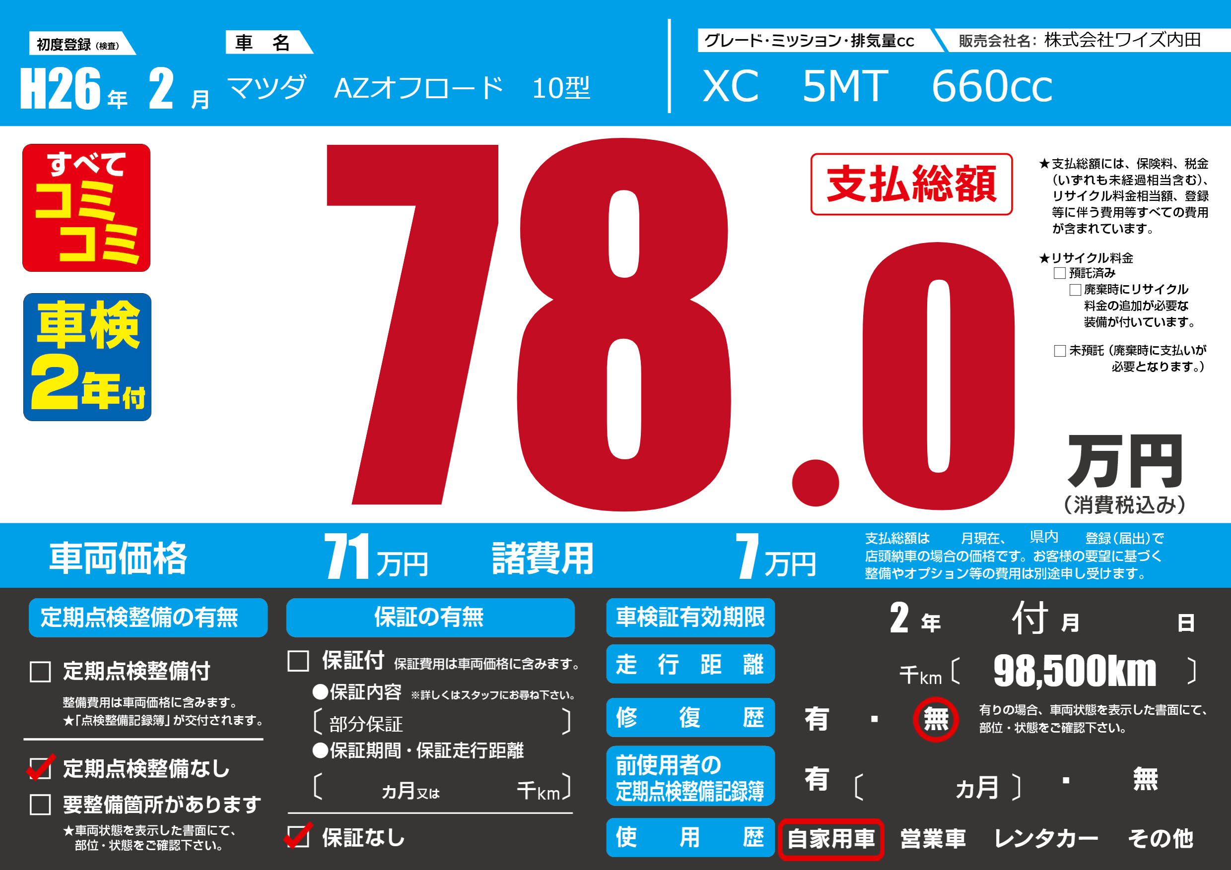 | 車名 | マツダ AZオフロード 10型 | グレード ミッション 排気量 |