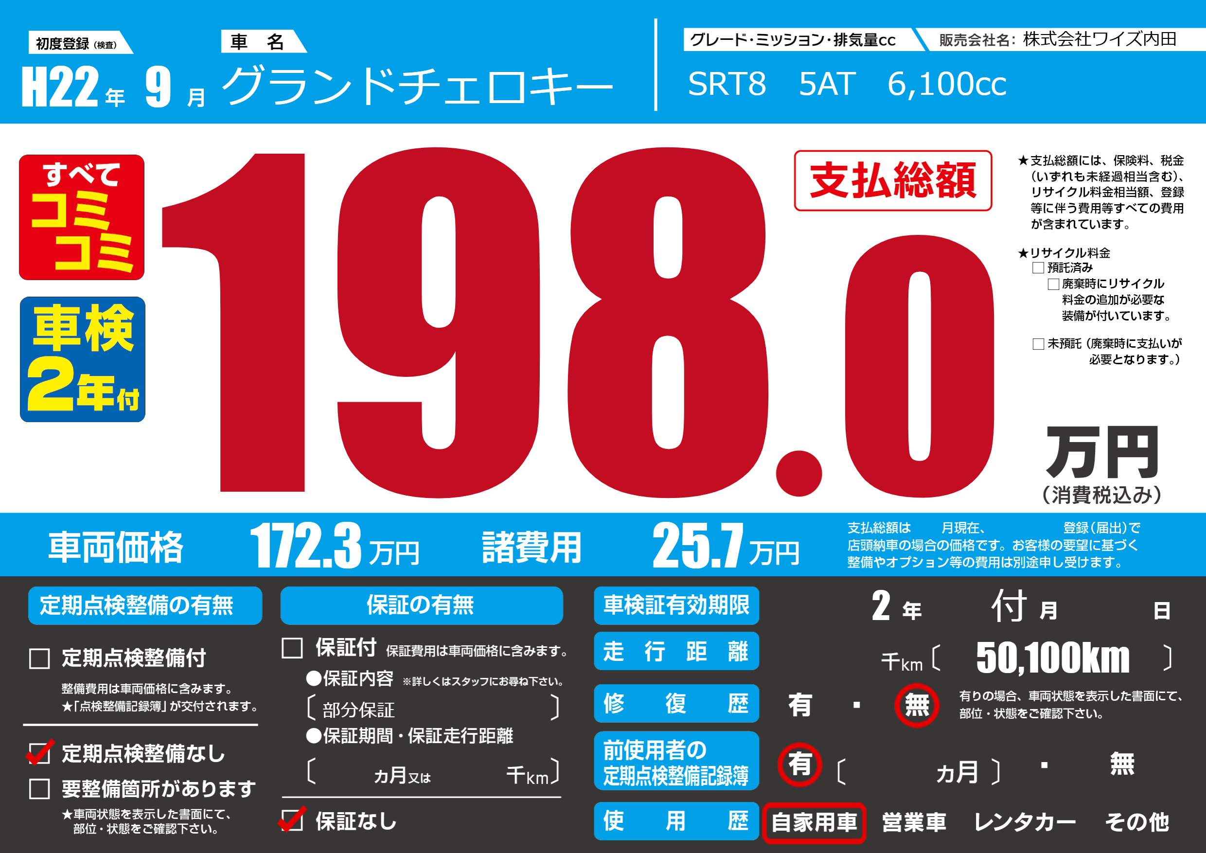 | 車名 | グランドチェロキー | グレード ミッション 排気量 |