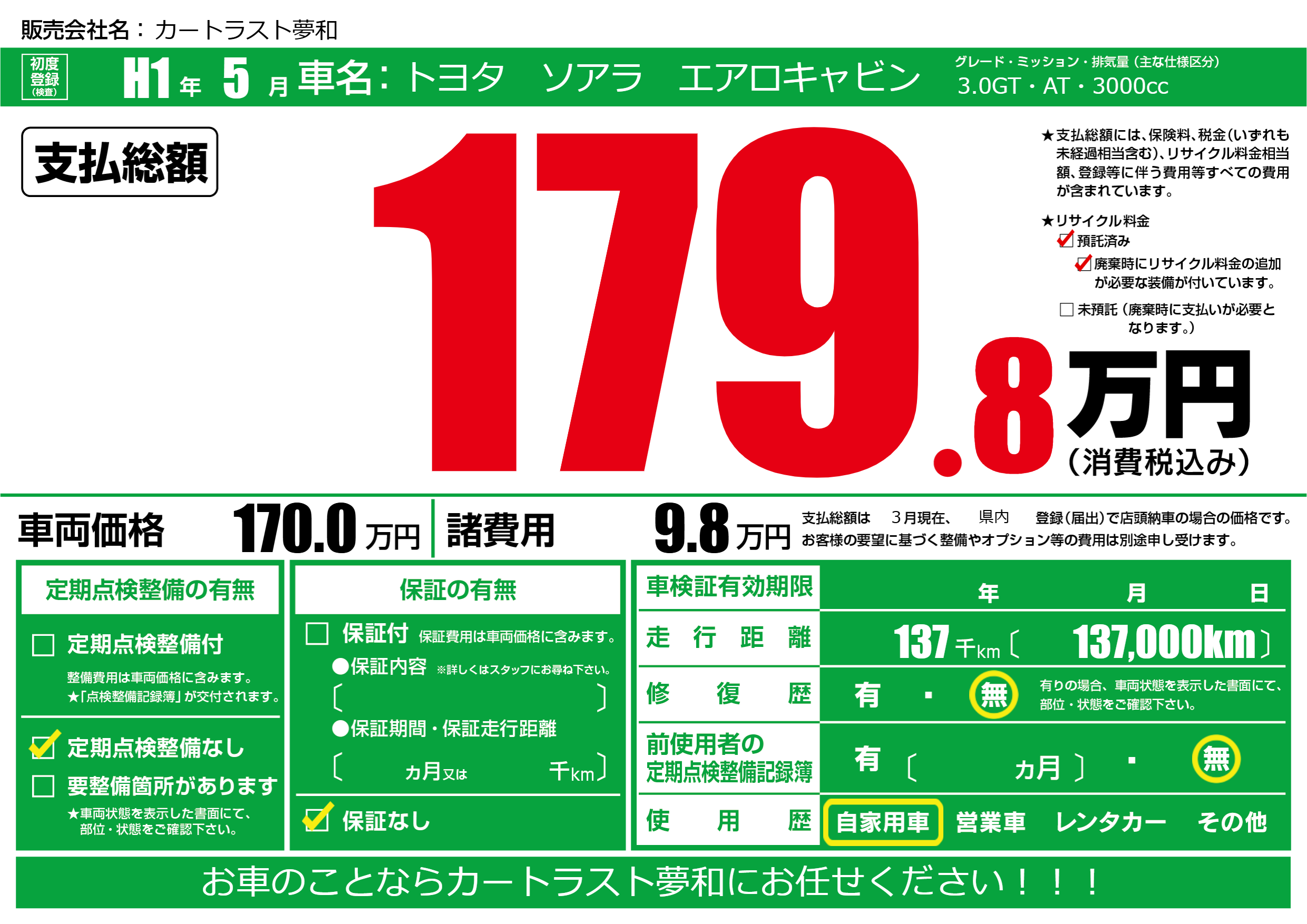 | 走行キロ | 13.7万km | 初年度登録 | H1年5月 |