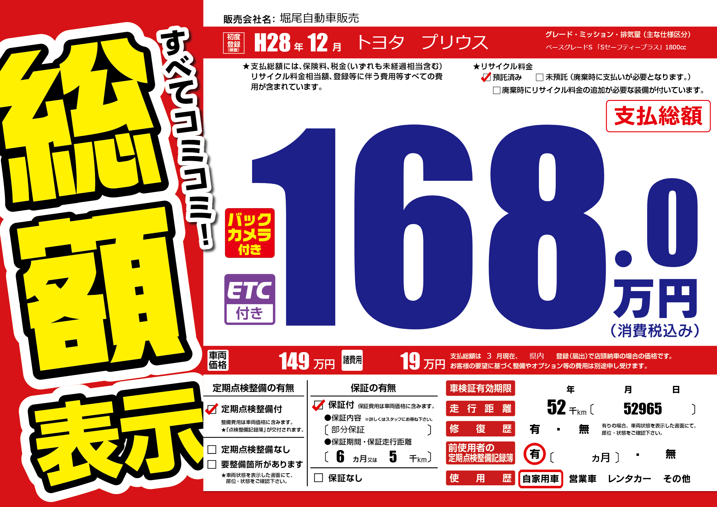 | 車名 | トヨタ プリウス | グレード ミッション 排気量 |