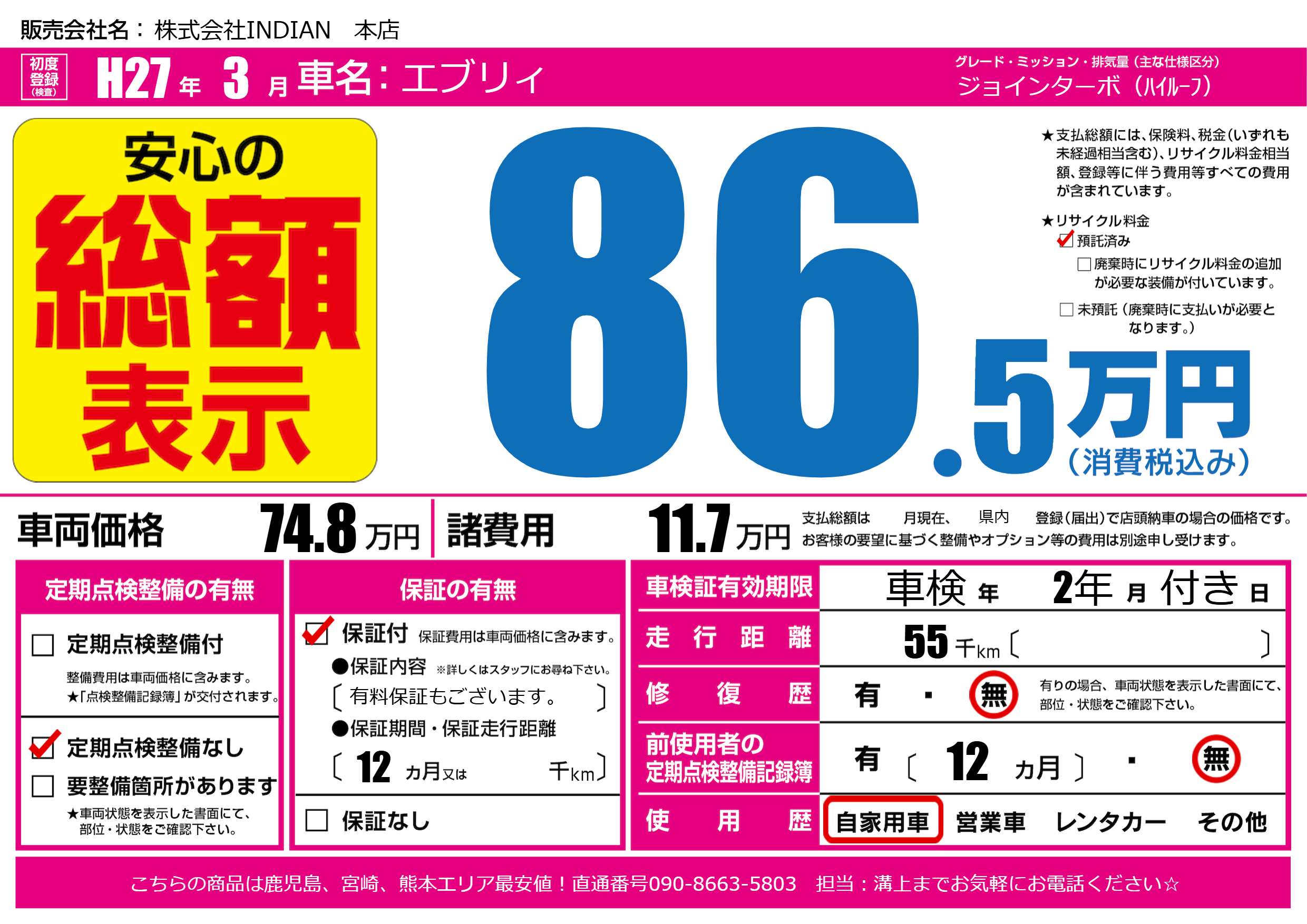 | 走行キロ | 5.5万km | 初年度登録 | H27年3月 |