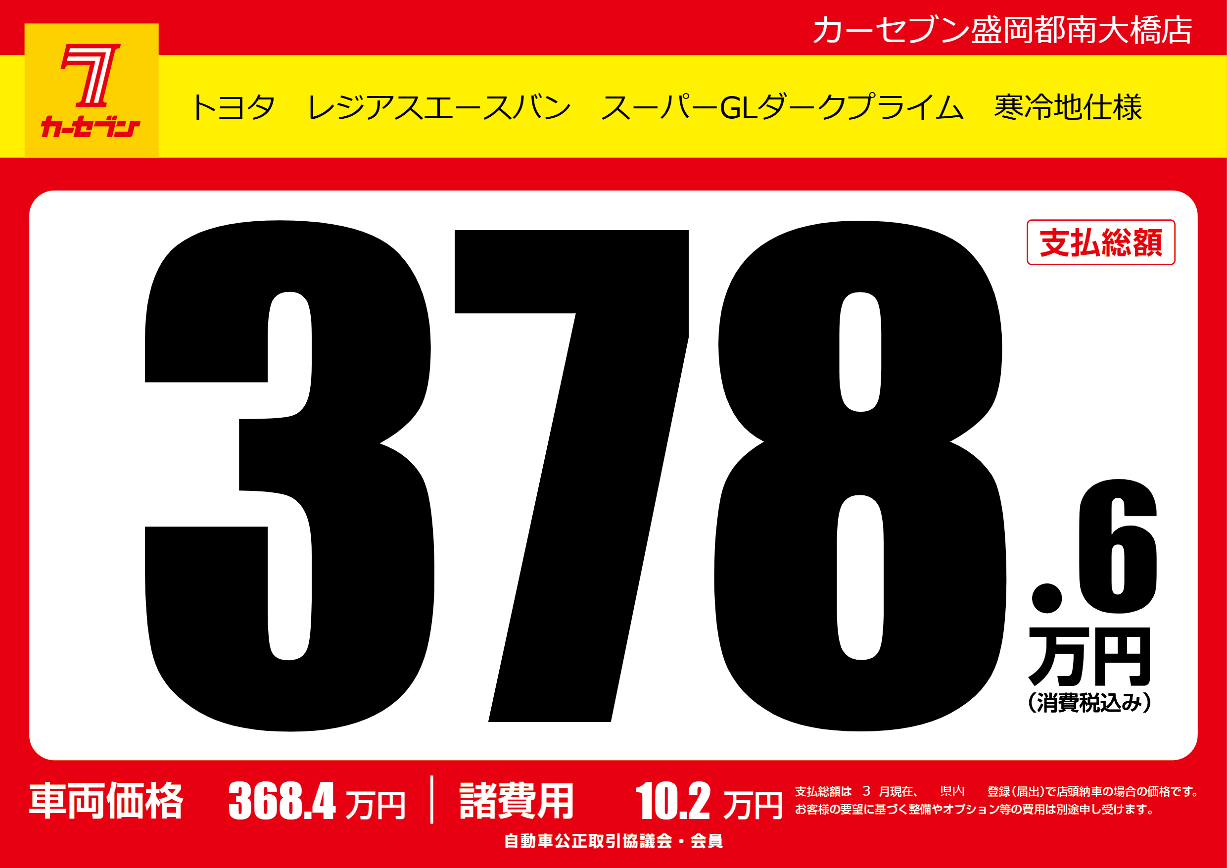 | 車名 | トヨタ レジアスエースバン スーパーGLダークプライム 寒冷地仕様 | グレード ミッション 排気量 |