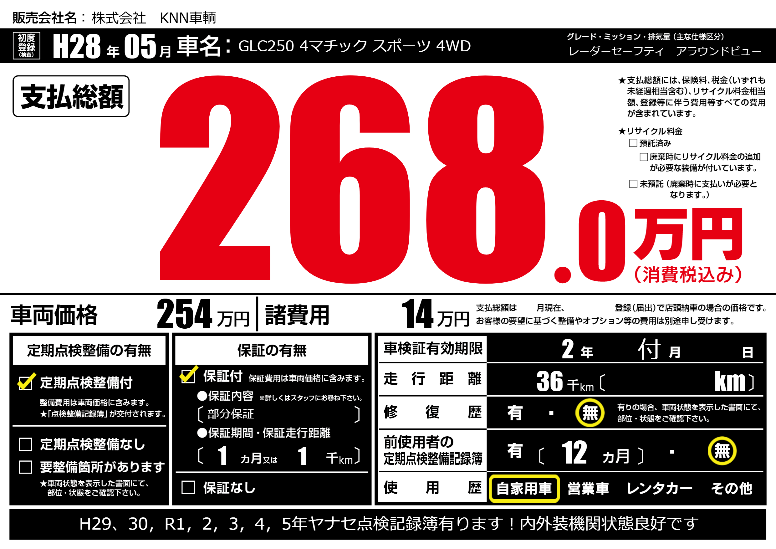 | 車名 | GLC250 4マチック スポーツ 4WD | グレード ミッション 排気量 |