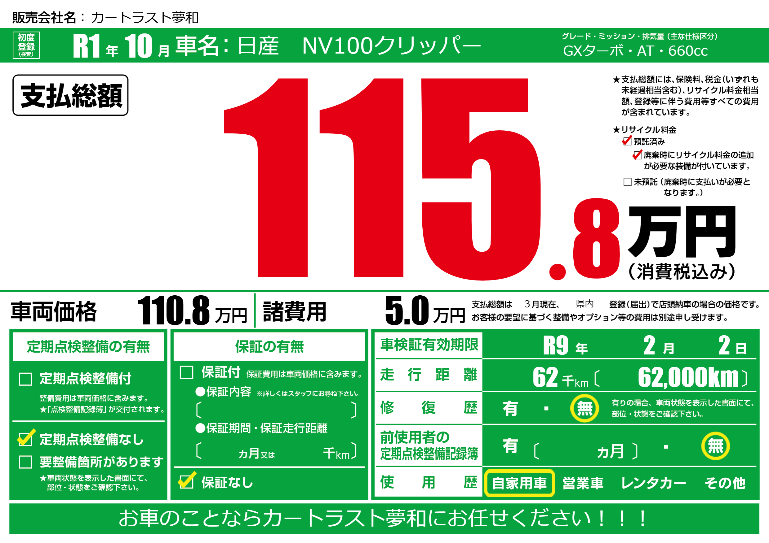 | 車名 | 日産 NV100クリッパー | グレード ミッション 排気量 |