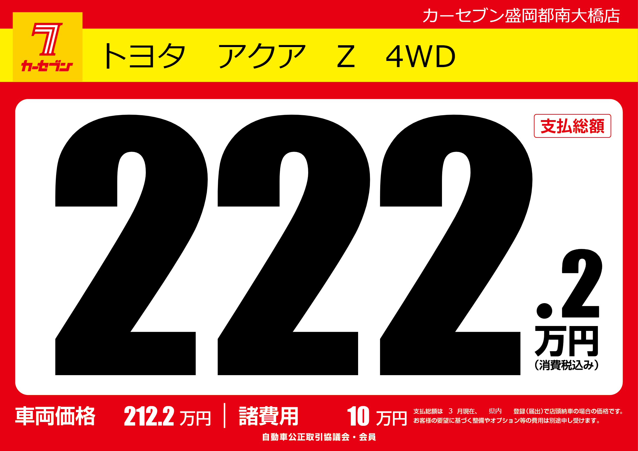 | 車名 | トヨタ アクア Z 4WD | グレード ミッション 排気量 |