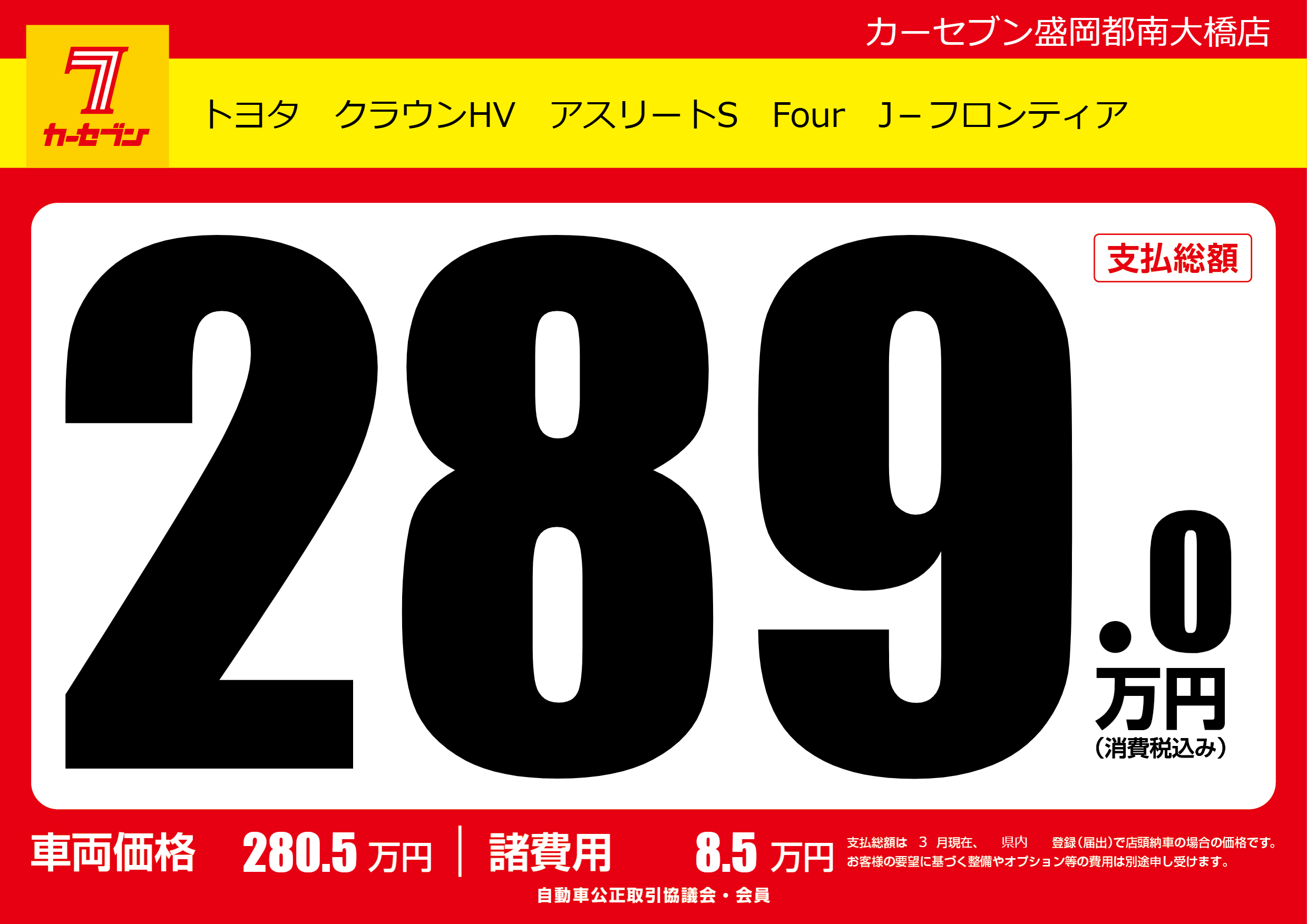 | 車名 | トヨタ クラウンHV アスリートS Four J-フロンティア | グレード ミッション 排気量 |