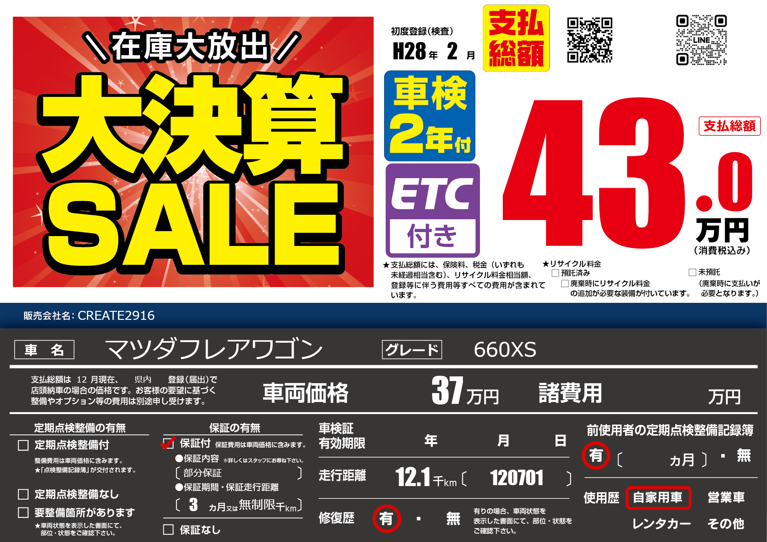 | 車名 | マツダフレアワゴン | グレード ミッション 排気量 |