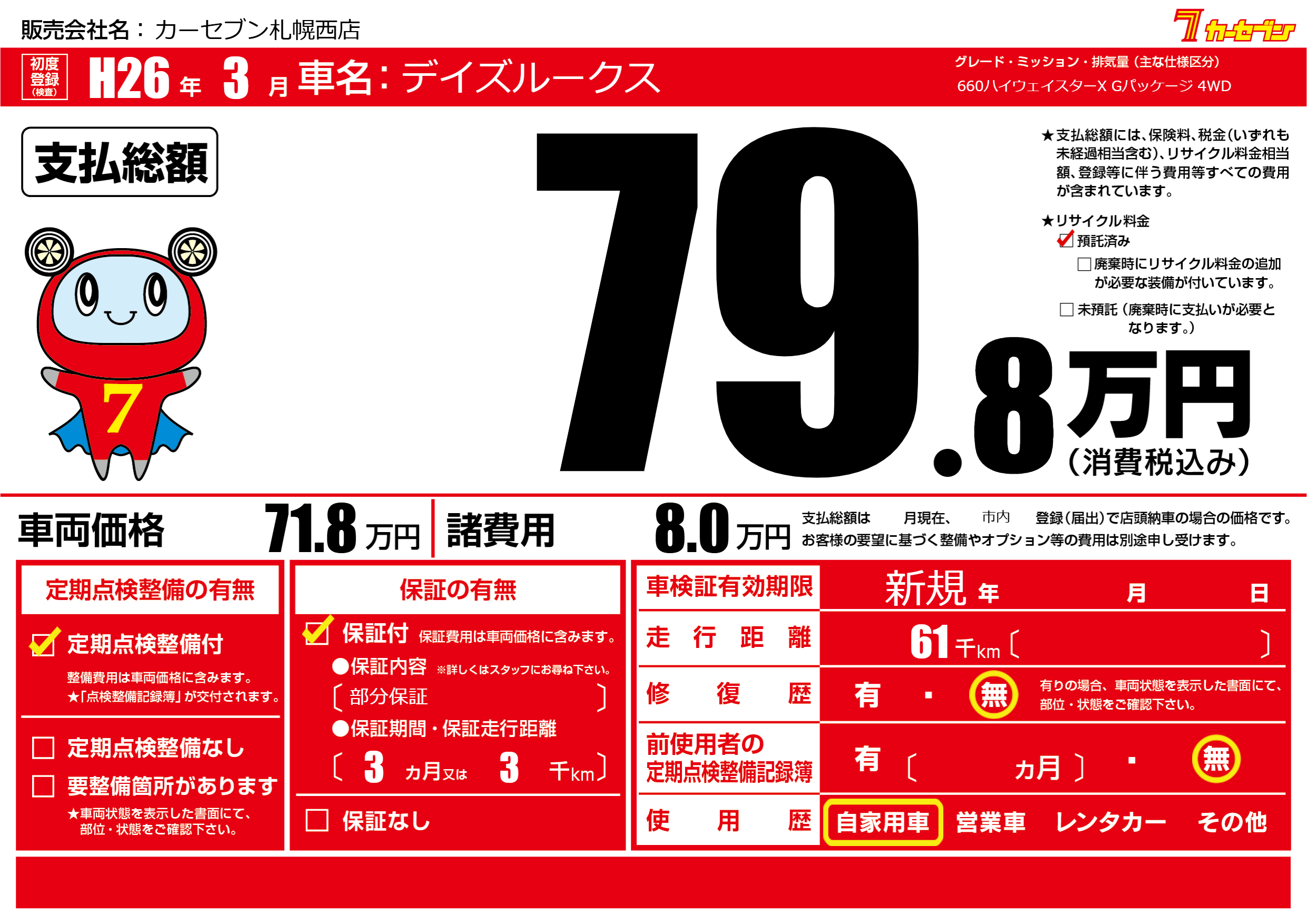 | 走行キロ | 6.1万km | 初年度登録 | H26年3月 |