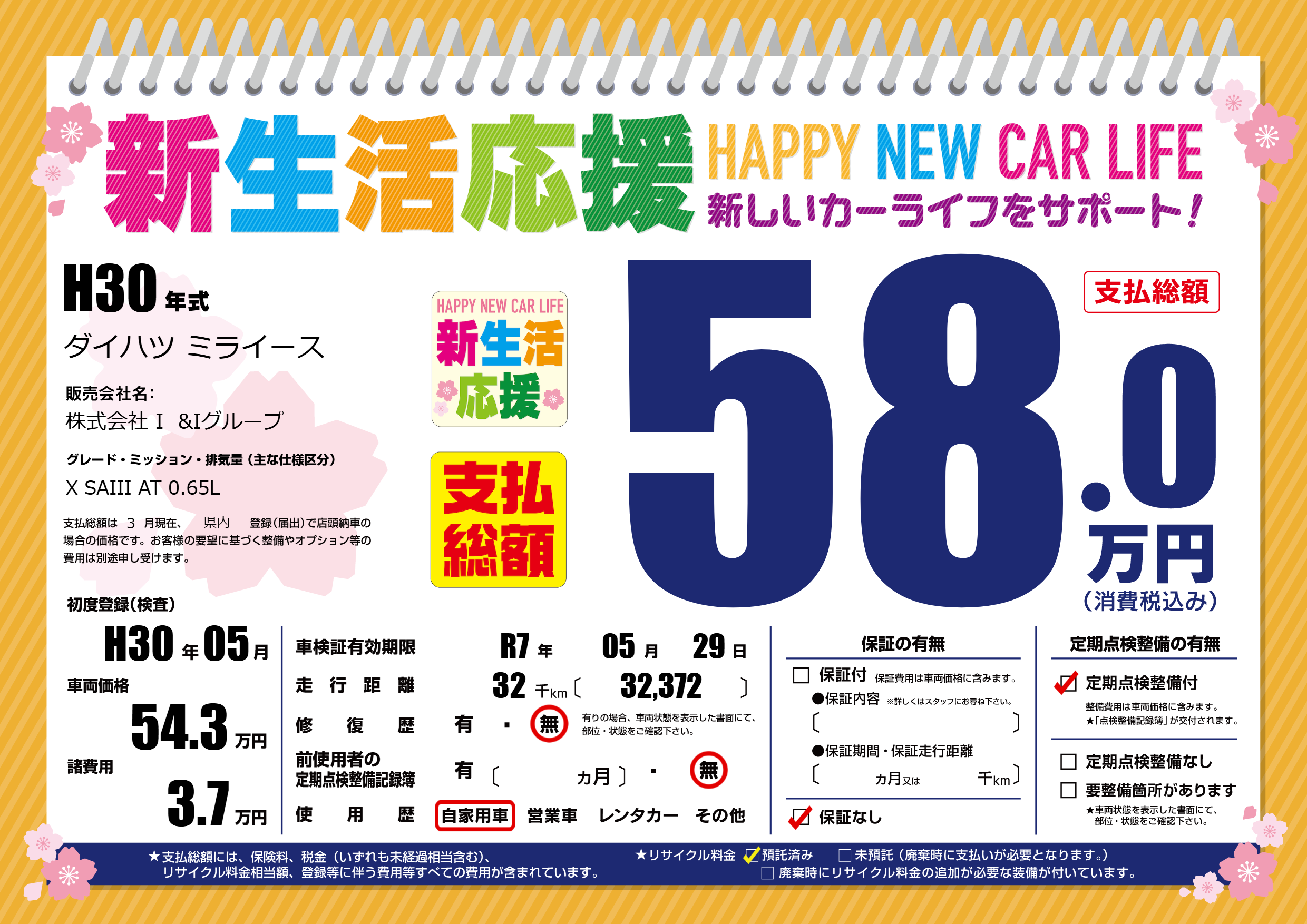 | 車名 | ダイハツ ミライース | グレード ミッション 排気量 |
