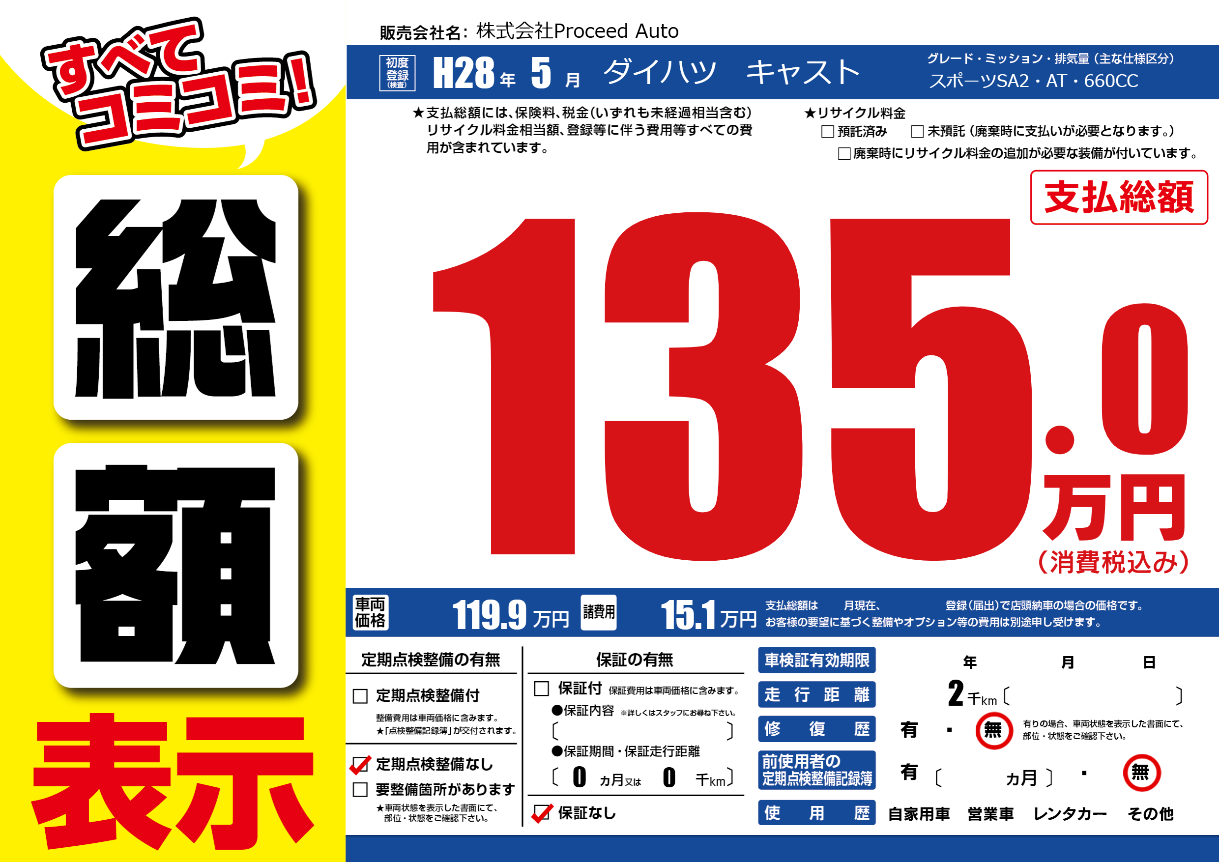 | 車名 | ダイハツ キャスト | グレード ミッション 排気量 |