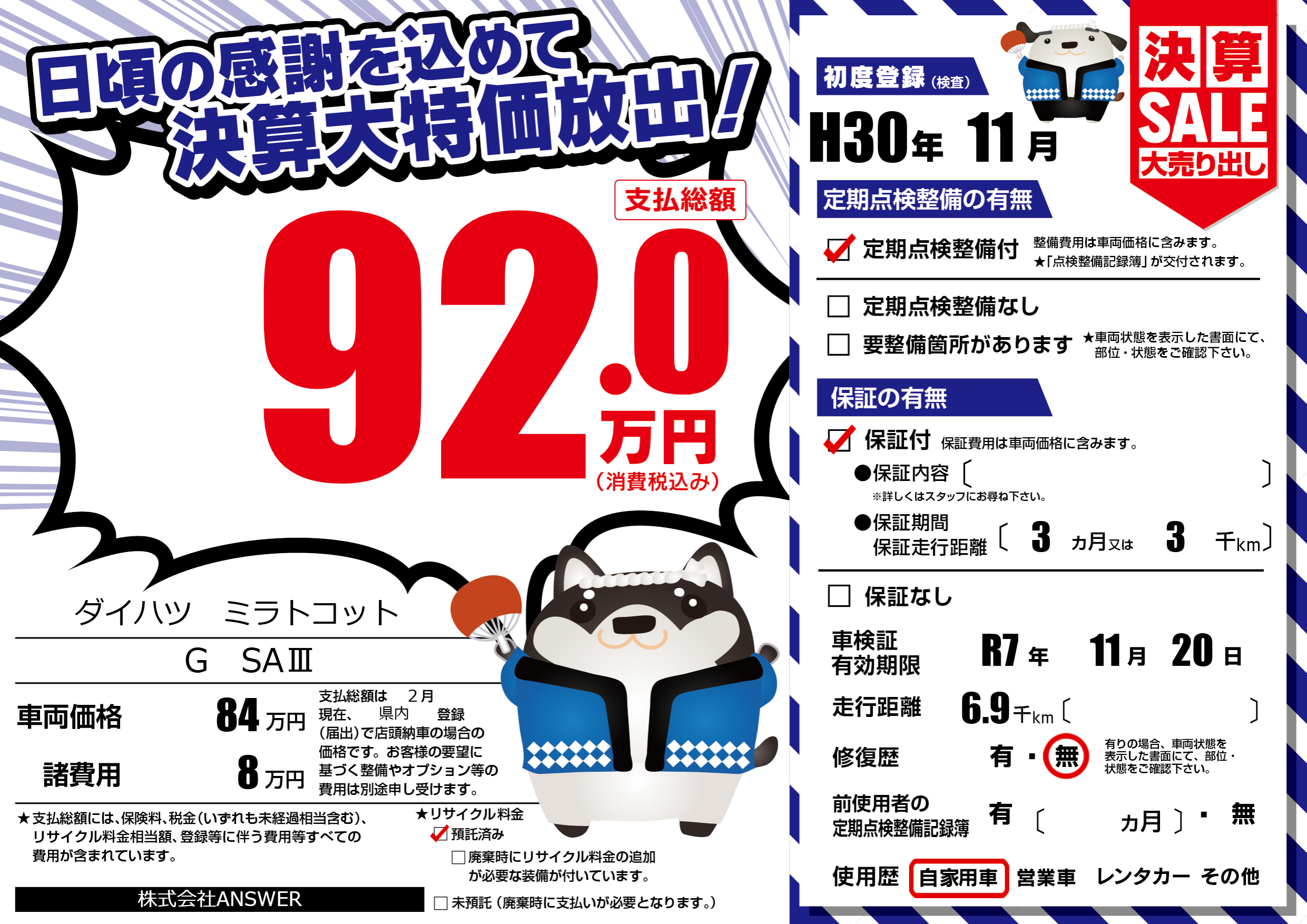 | 走行キロ | 0.6万km | 初年度登録 | H30年11月 |
