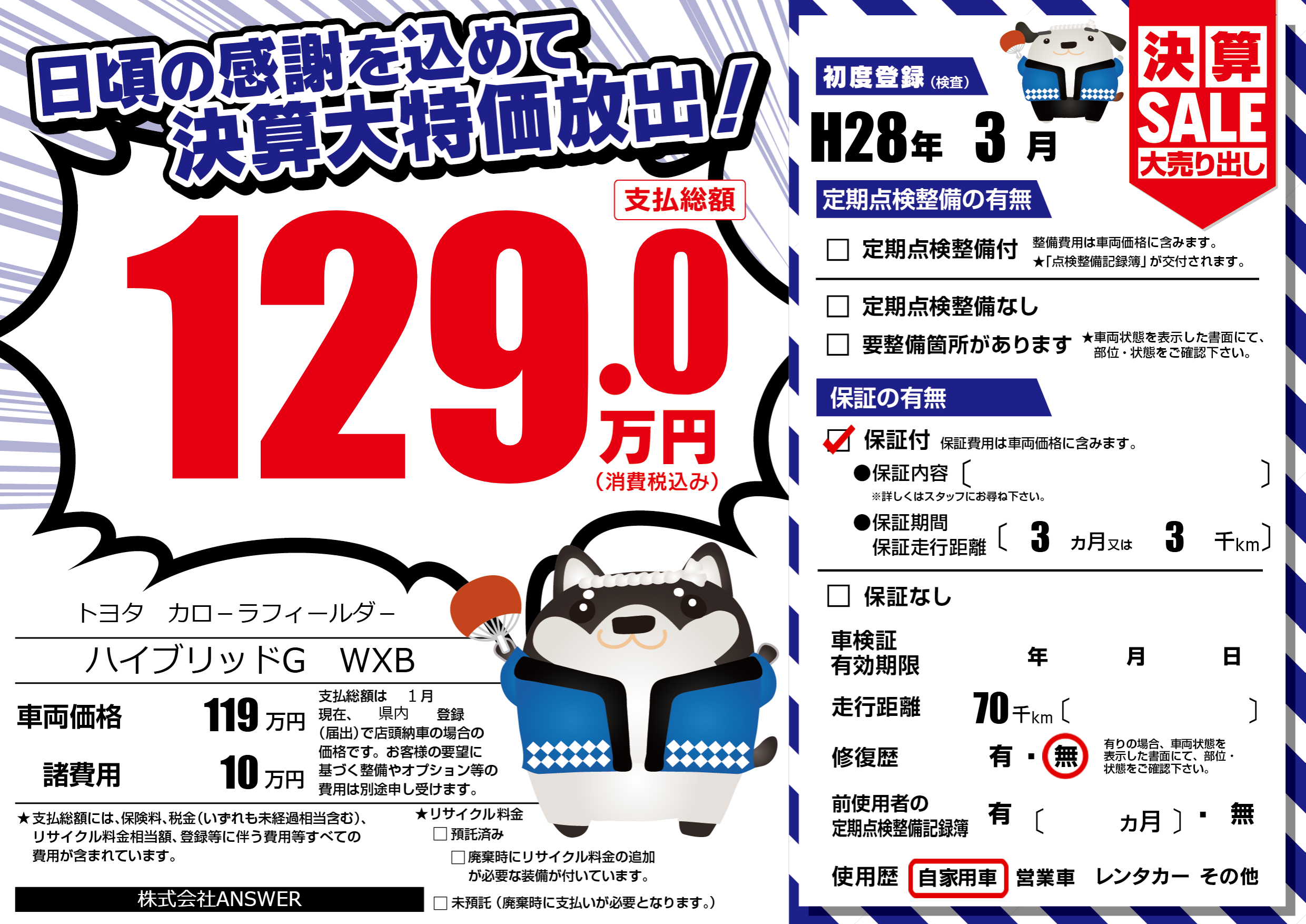 | 走行キロ | 7万km | 初年度登録 | H28年3月 |