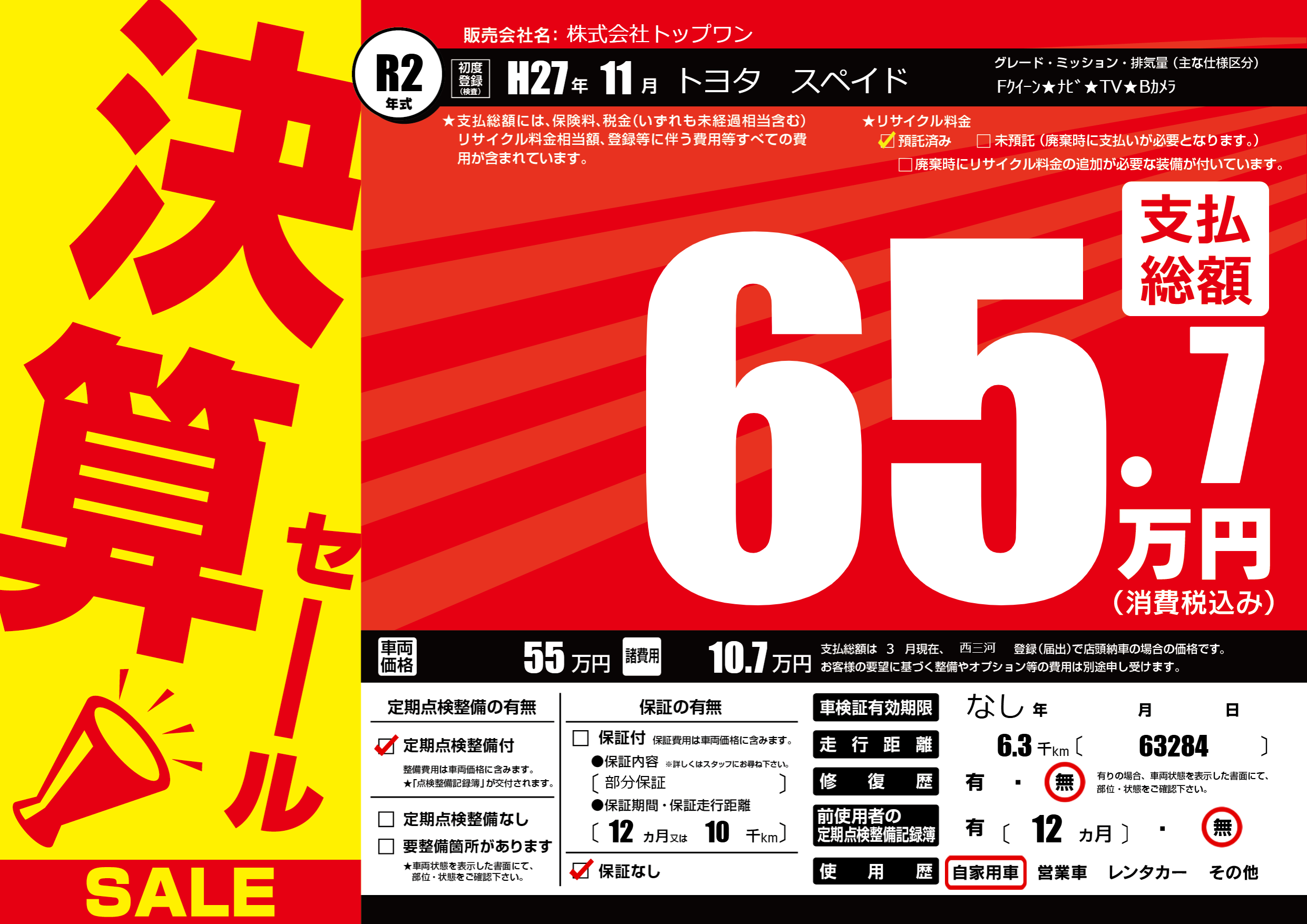 | 車名 | トヨタ スペイド | グレード ミッション 排気量 |