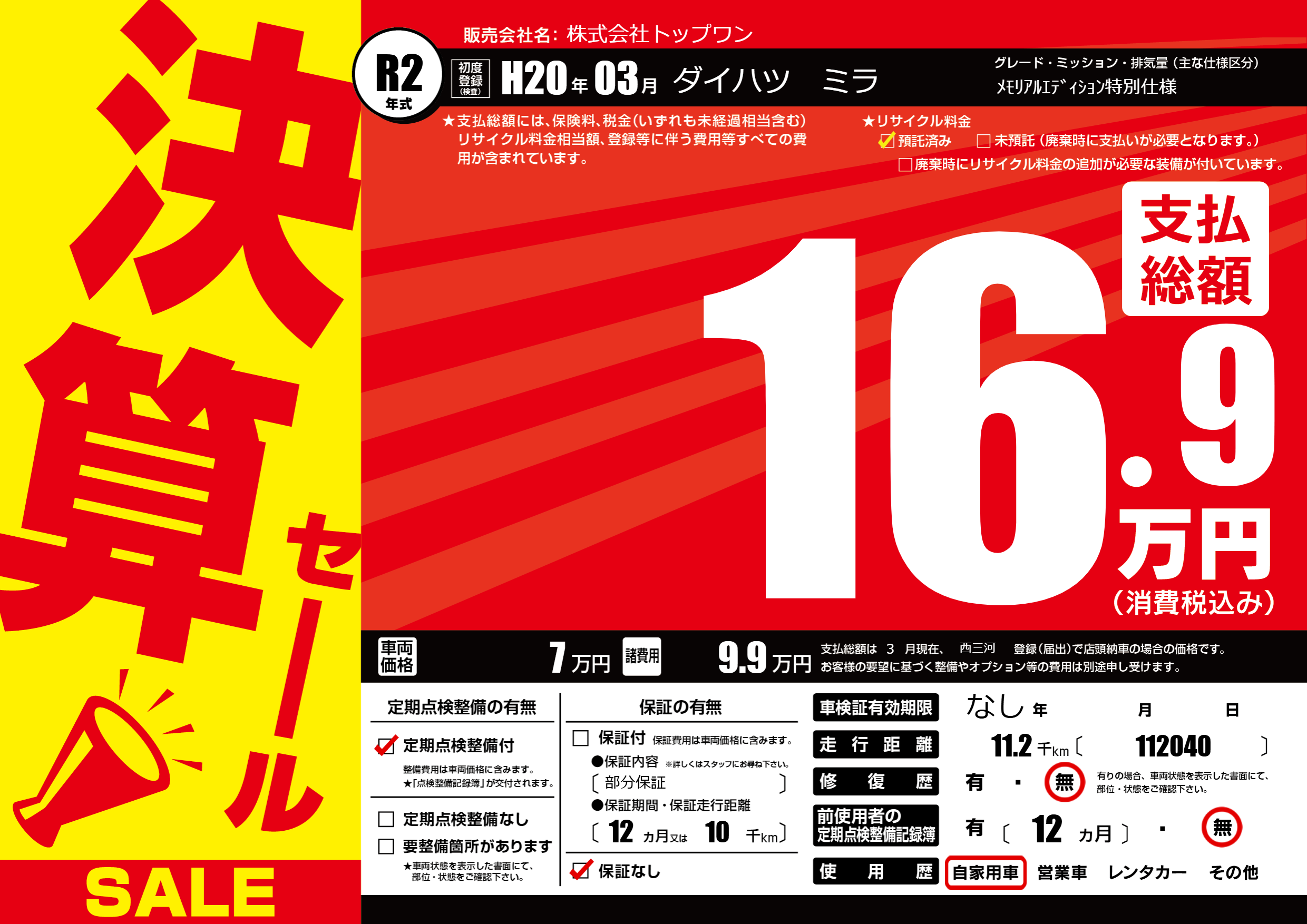 | 走行キロ | 1.1万km | 初年度登録 | H20年03月 |