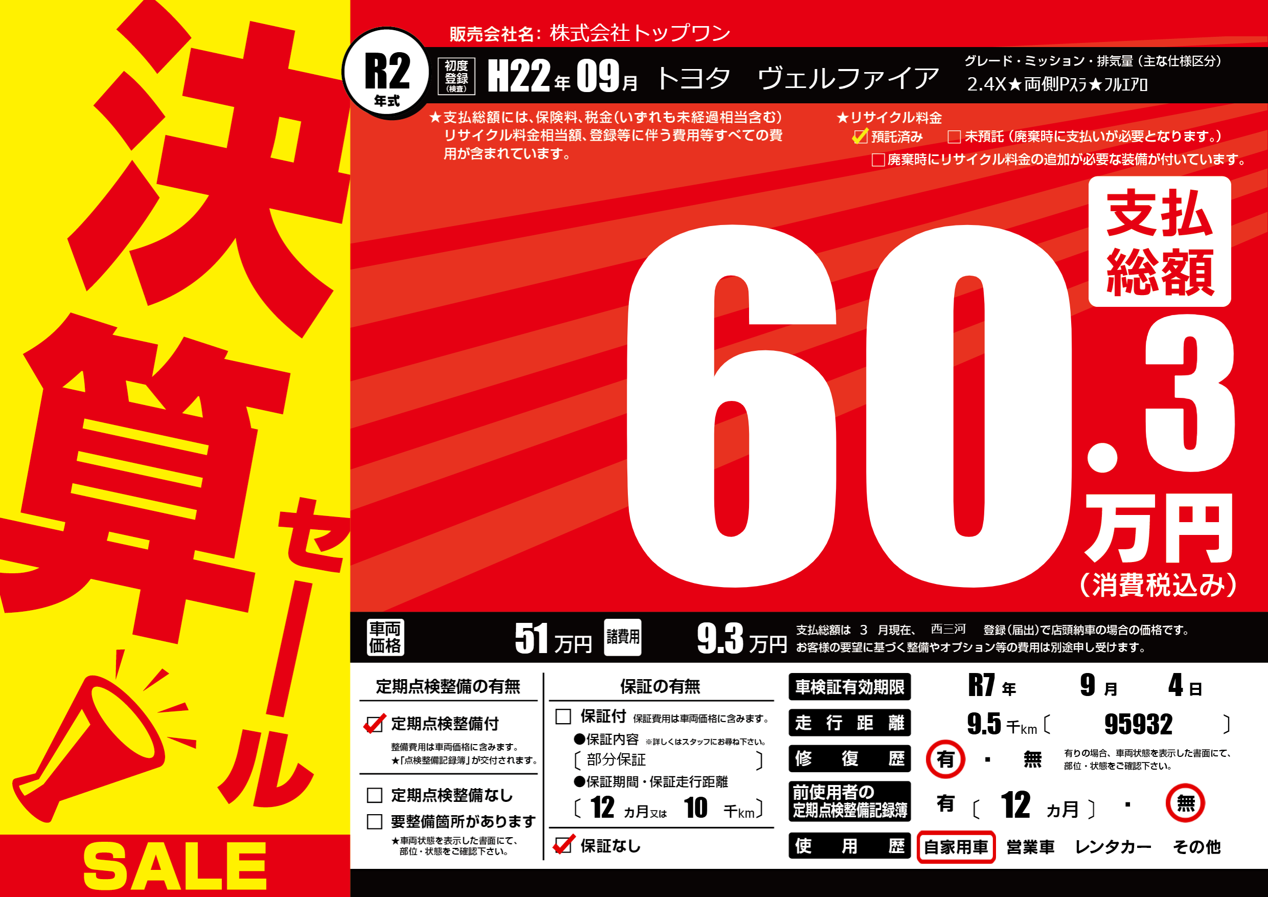 | 車名 | トヨタ ヴェルファイア | グレード ミッション 排気量 |