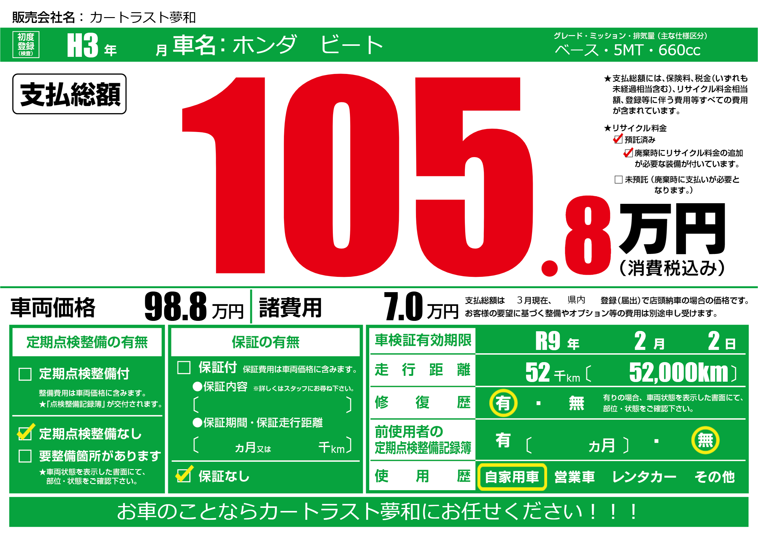 | 車名 | ホンダ ビート | グレード ミッション 排気量 |