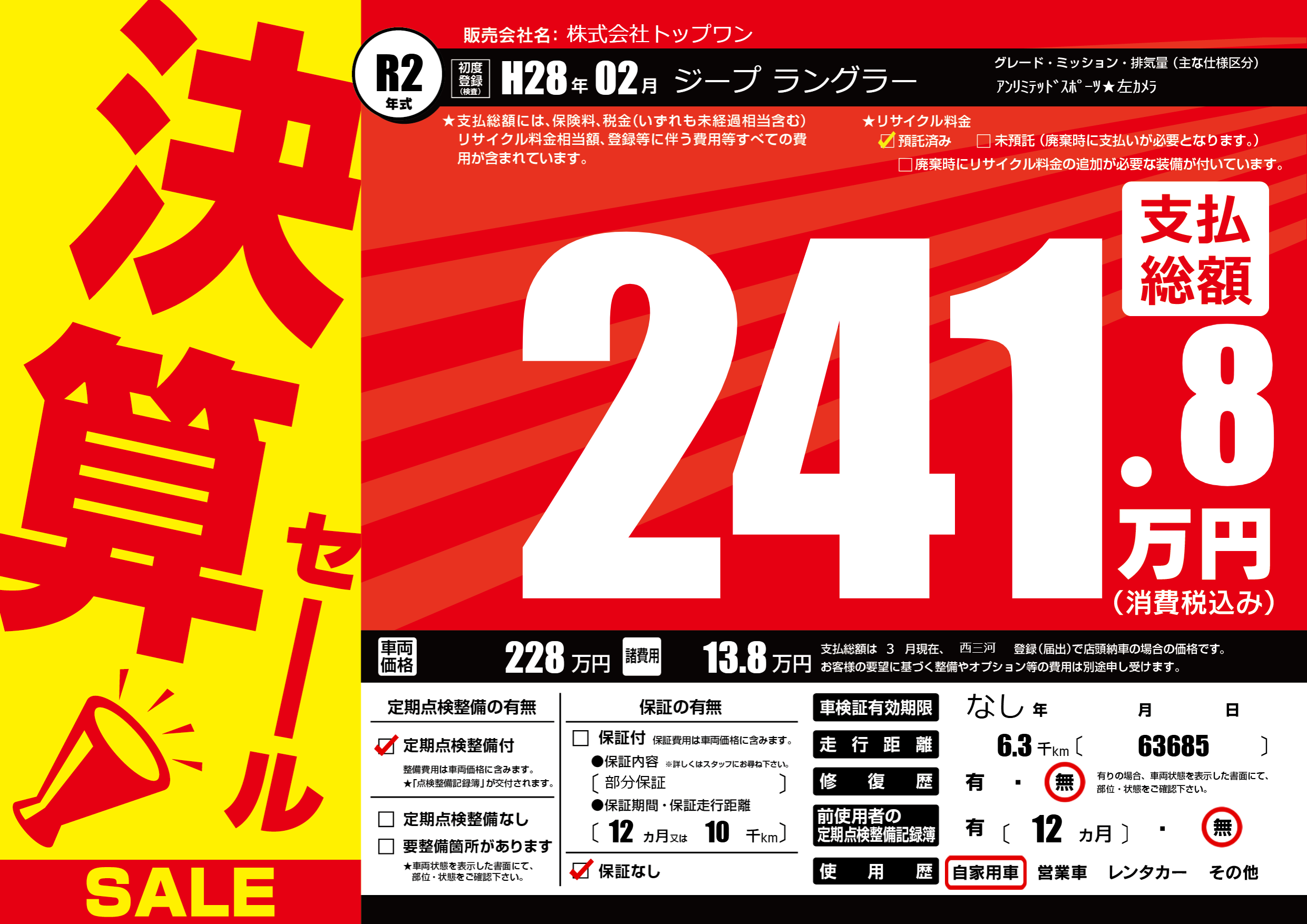 | 車名 | ジープ ラングラー | グレード ミッション 排気量 |