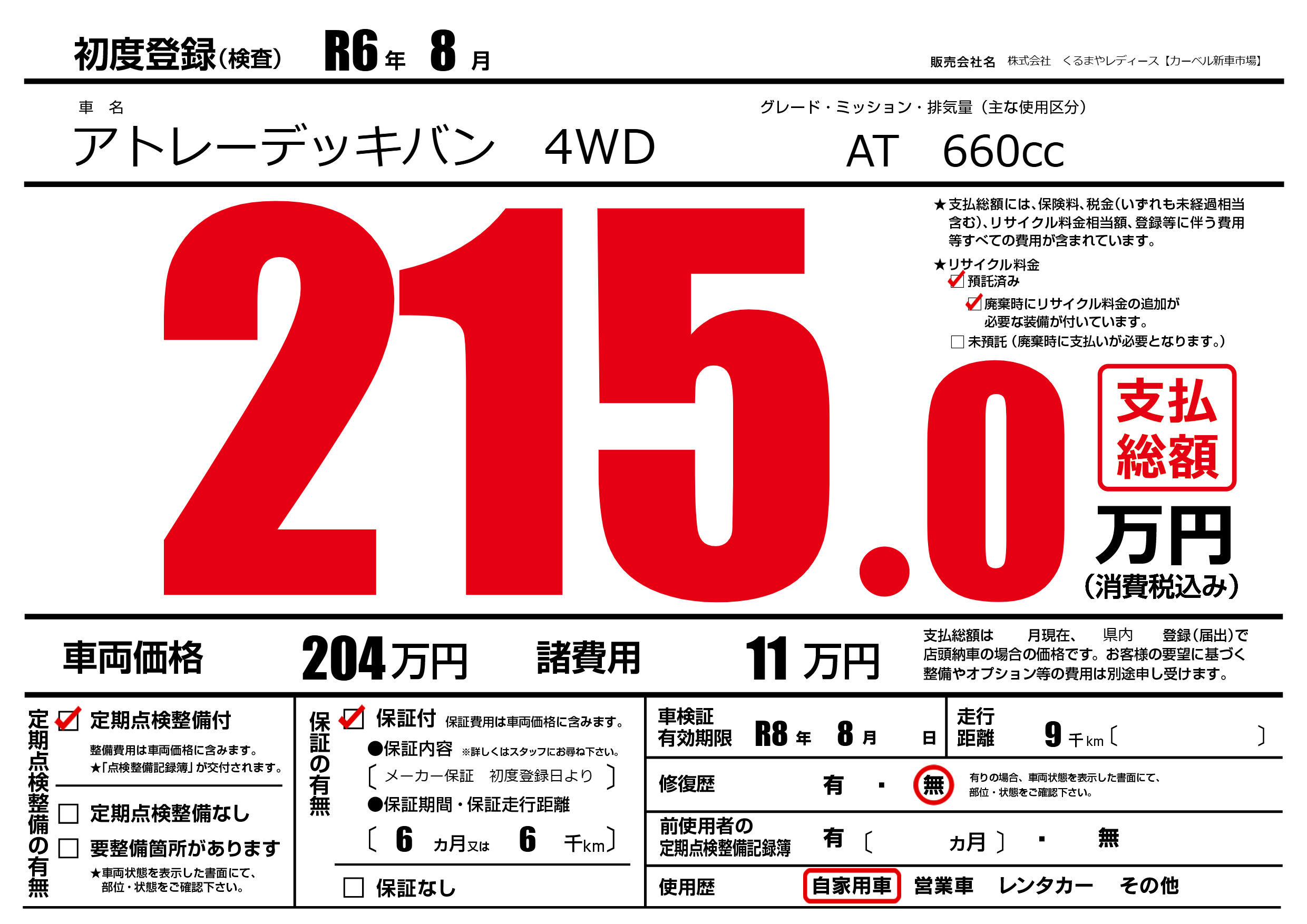 | 車名 | アトレーデッキバン 4WD | グレード ミッション 排気量 |
