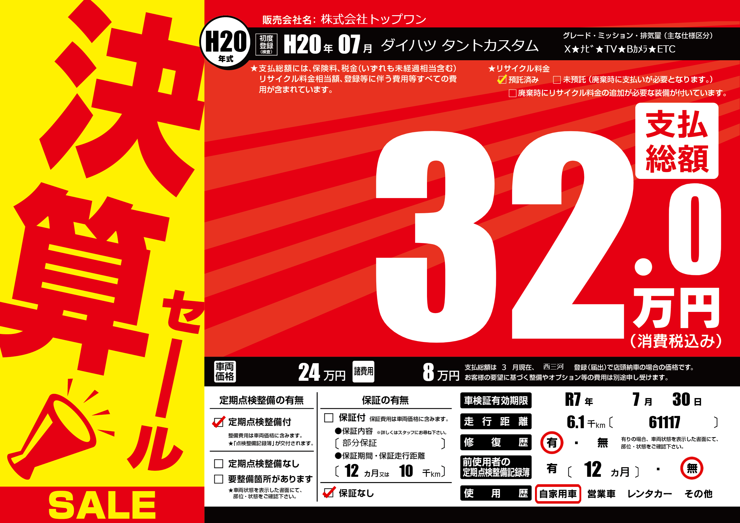 | 車名 | ダイハツ タントカスタム | グレード ミッション 排気量 |