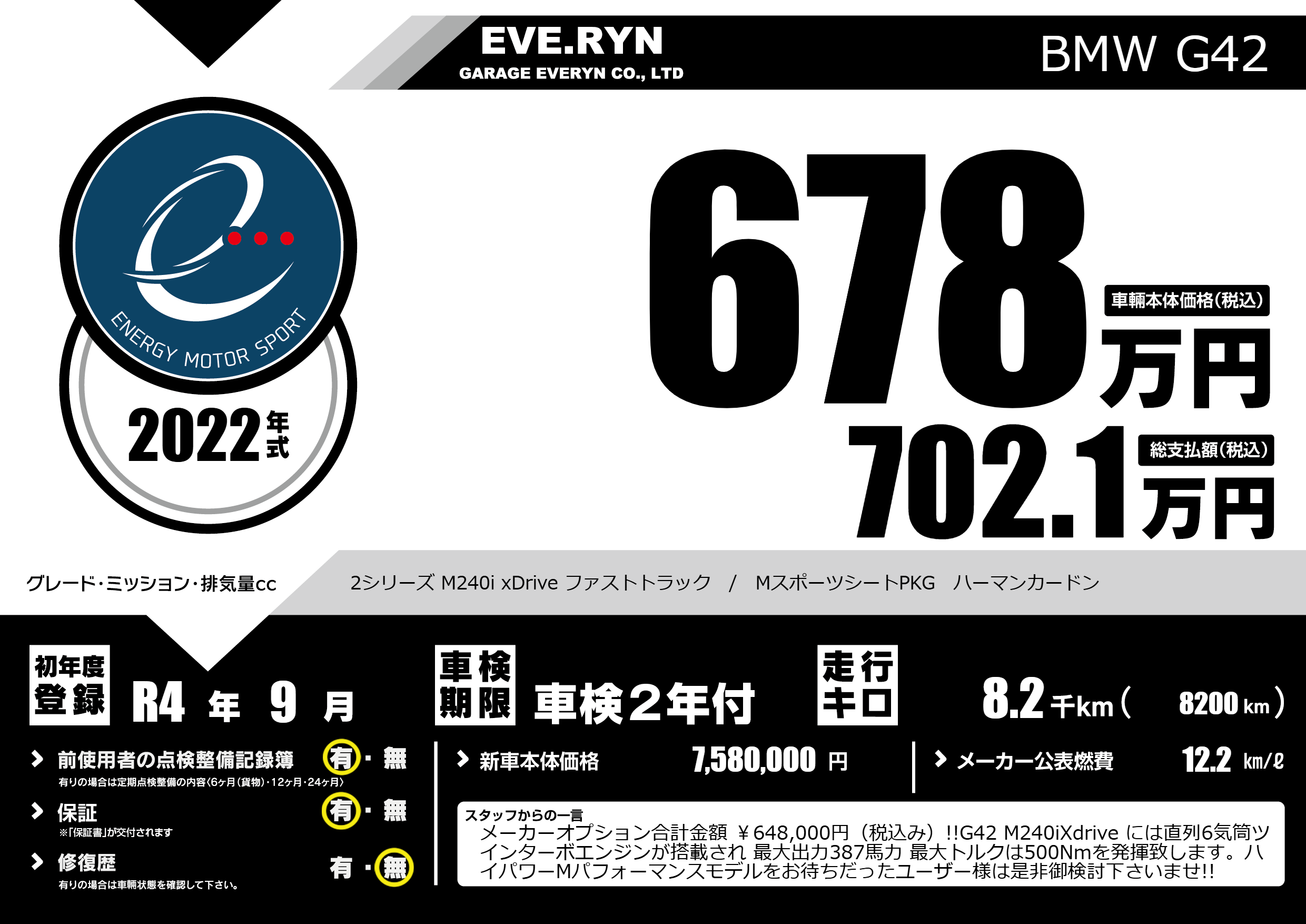 | 車名 | BMW G42 | グレード ミッション 排気量 |