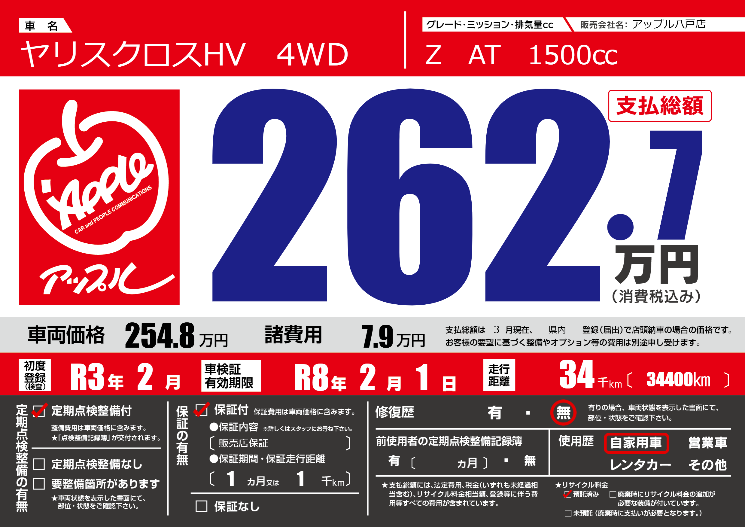 | 車名 | ヤリスクロスHV 4WD | グレード ミッション 排気量 |