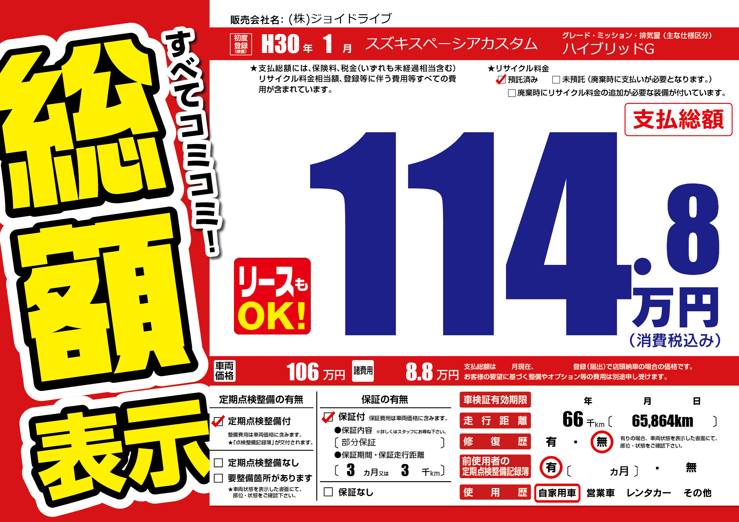 | 走行キロ | 6.6万km | 初年度登録 | H30年1月 |