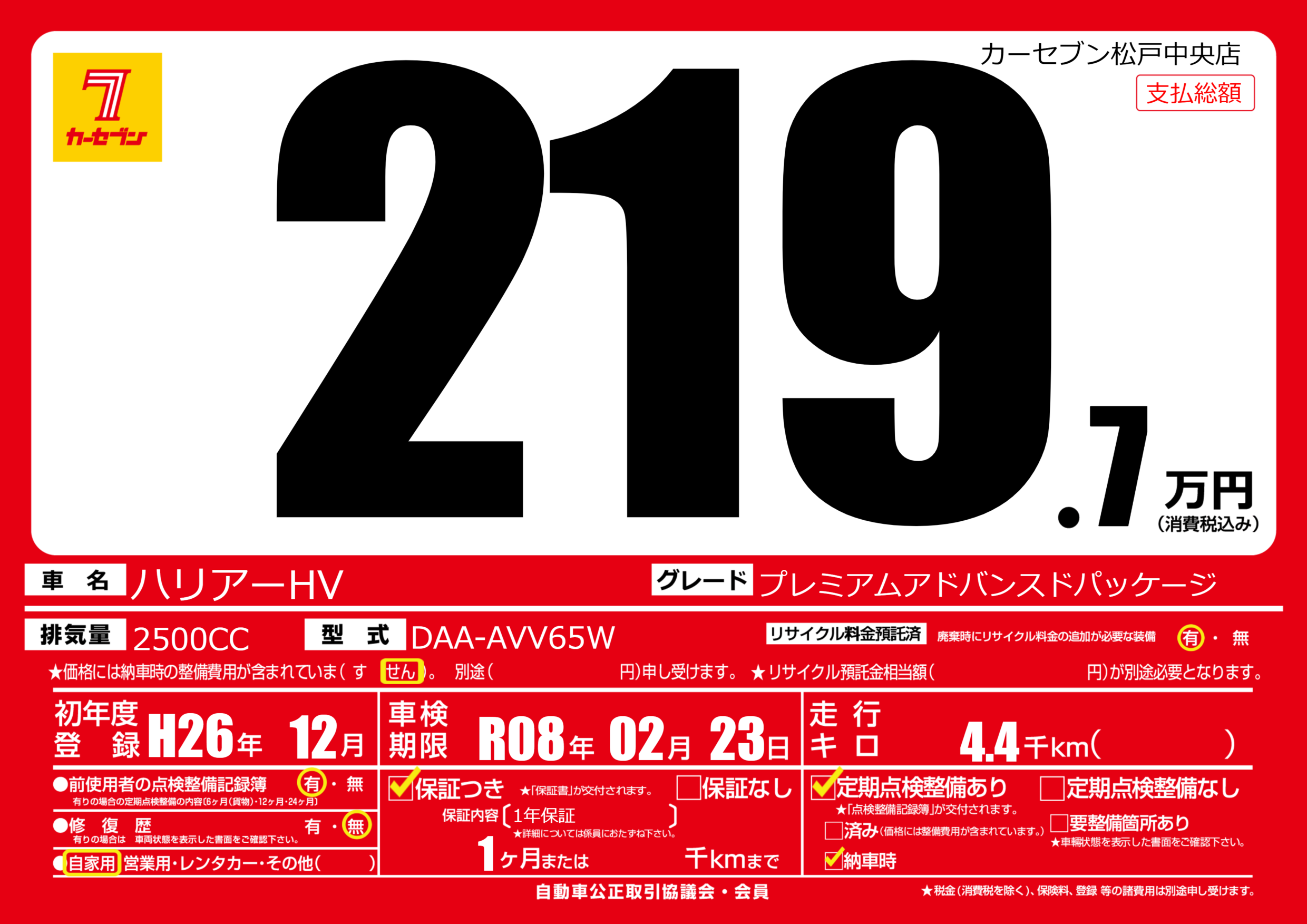 | 走行キロ | 0.4万km | 初年度登録 | H26年12月 |
