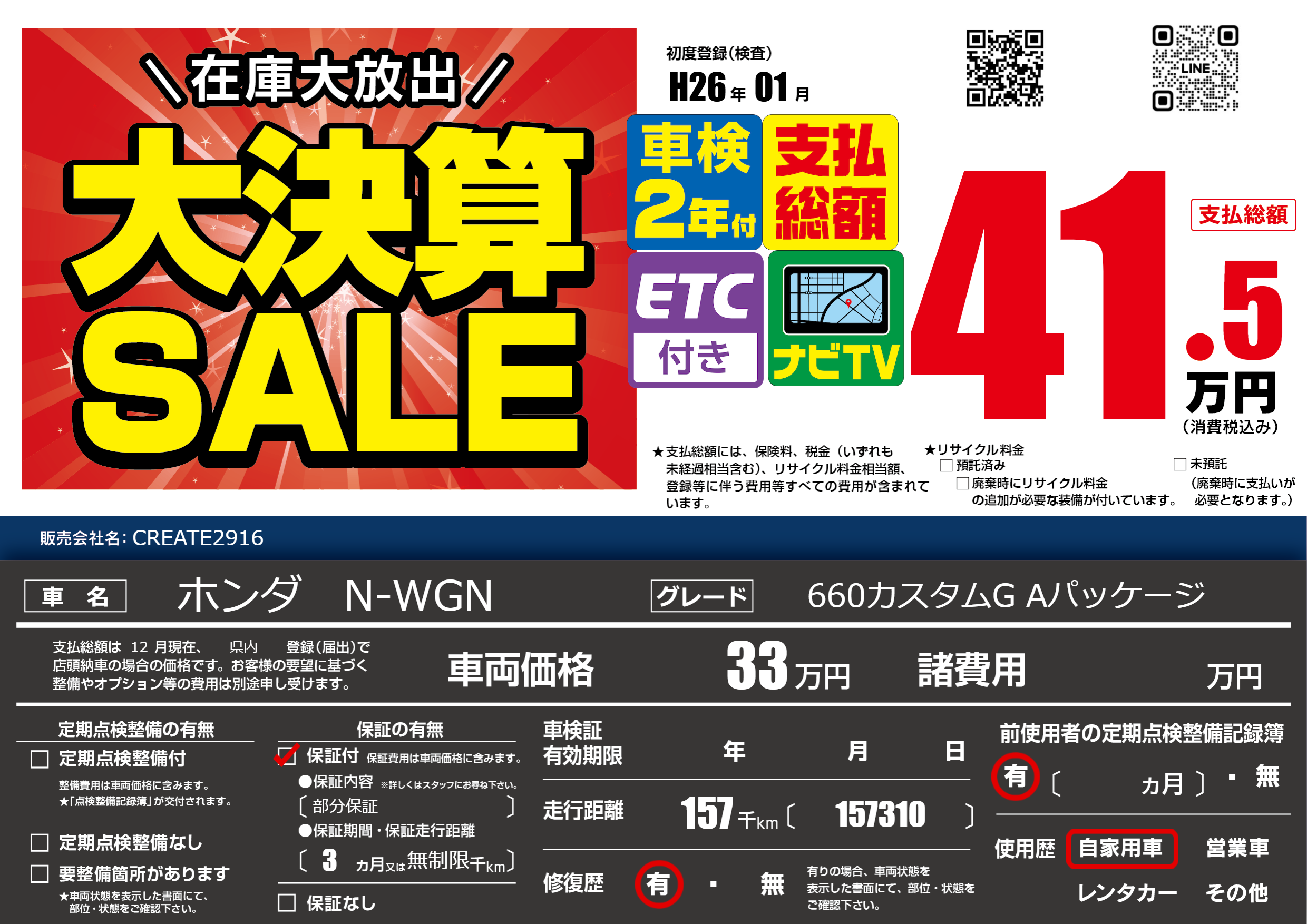 | 走行キロ | 15.7万km | 初年度登録 | H26年01月 |