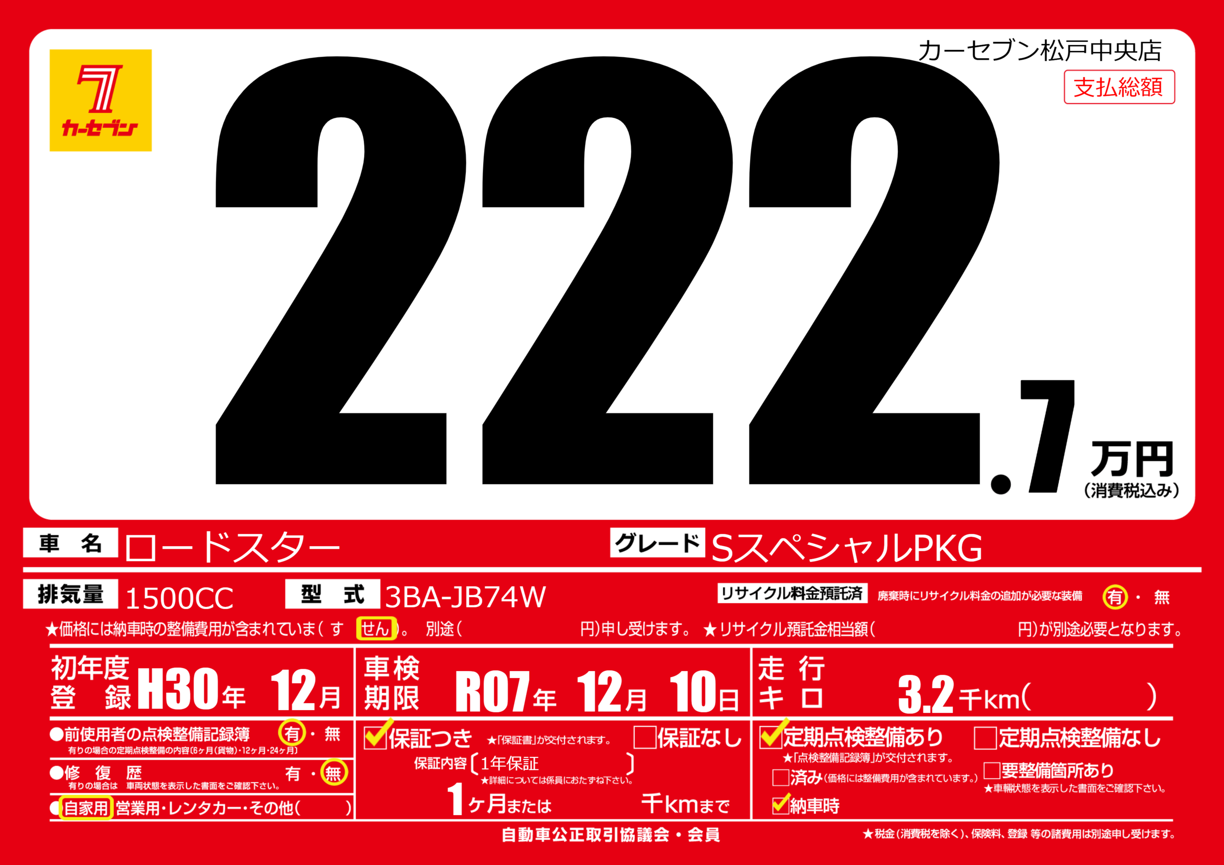 | 走行キロ | 0.3万km | 初年度登録 | H30年12月 |